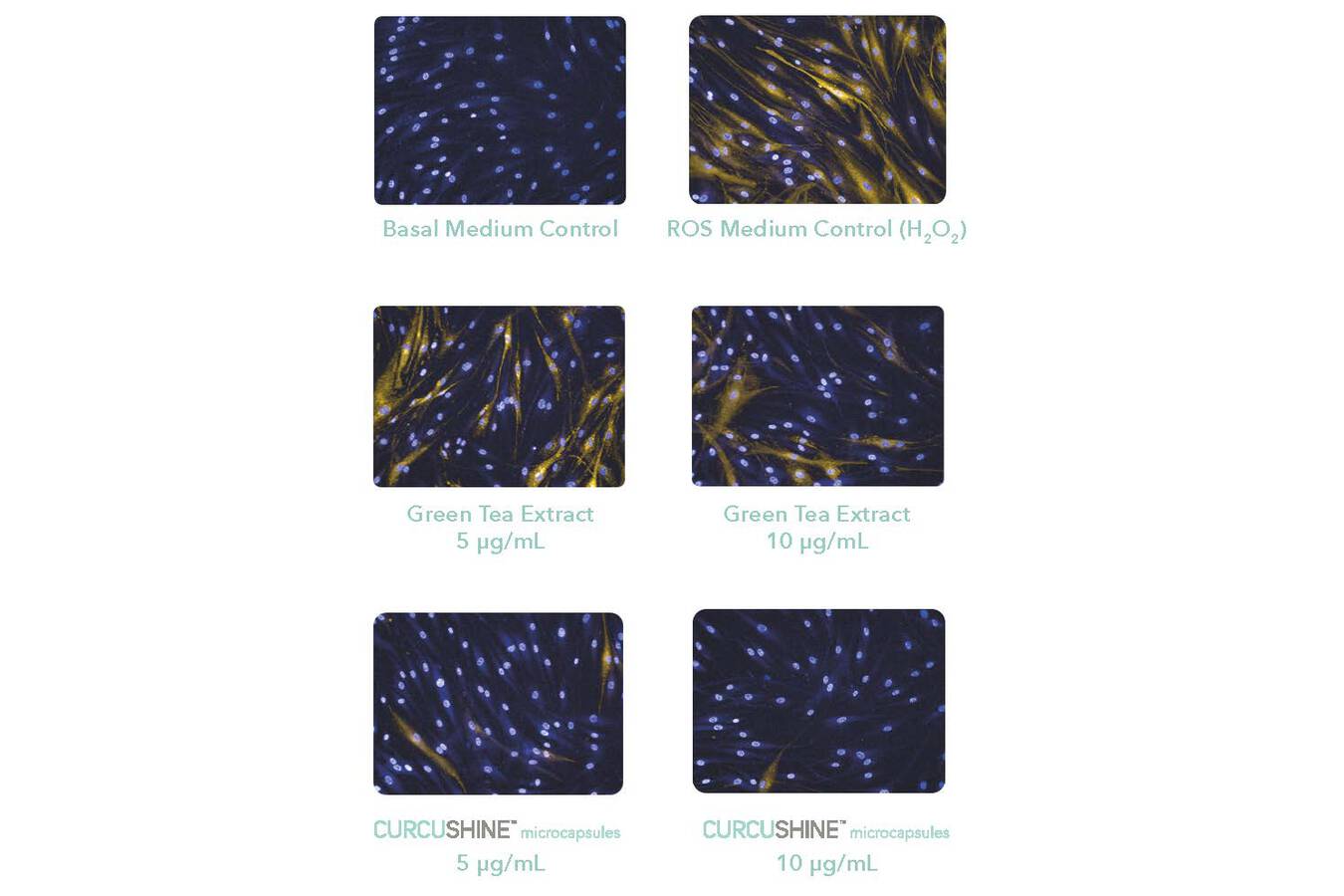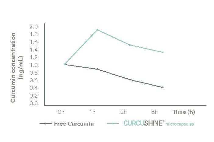 Neben den physikalischen Produkteigenschaften profitiert der optimierte Curcumin-Extrakt auch in Bezug auf die Maskierung seines Geschmacks und Geruchs im gelösten Zustand. Die bioaktiven Eigenschaften wurden in mehreren Studien untersucht: Die Bioverfügbarkeit der Partikel wurde zunächst in vitro bewertet und in Makrophagen (spezialisierte Zellen vom Typ J774A.1, die an der Immunantwort beteiligt sind), einer immortalisierten Zelllinie, die aus menschlichen Leberkarzinomzellen (HepG2) gebildet wurde und menschlichen kolorektalen Adenokarzinomzellen (Caco2), die den Darm simulieren, bestätigt (Abbildung 3). Die Daten wurden dann in einer In-vivo-Studie bestätigt, bei der eine Gruppe gesunder Freiwilliger 750 mg Kurkumaextrakt und das Äquivalent der „Curcushine“ getauften innovativen Mikrokapseln einnahm. Die Ergebnisse zeigten eine zweifache Steigerung der Bioverfügbarkeit und eine anhaltende Freisetzung über einen Zeitraum von acht Stunden (Abbildung 4). Das kommerzielle Präparat Curcushine wurde auch auf seine Fähigkeit getestet, der schädlichen Wirkung reaktiver Sauerstoffspezies (ROS) auf Hautzellen entgegenzuwirken. Im Vergleich zu Grüntee-Extrakt, einem bekannten Antioxidans, erwies es sich als wesentlich wirksamer (Abbildung 5).