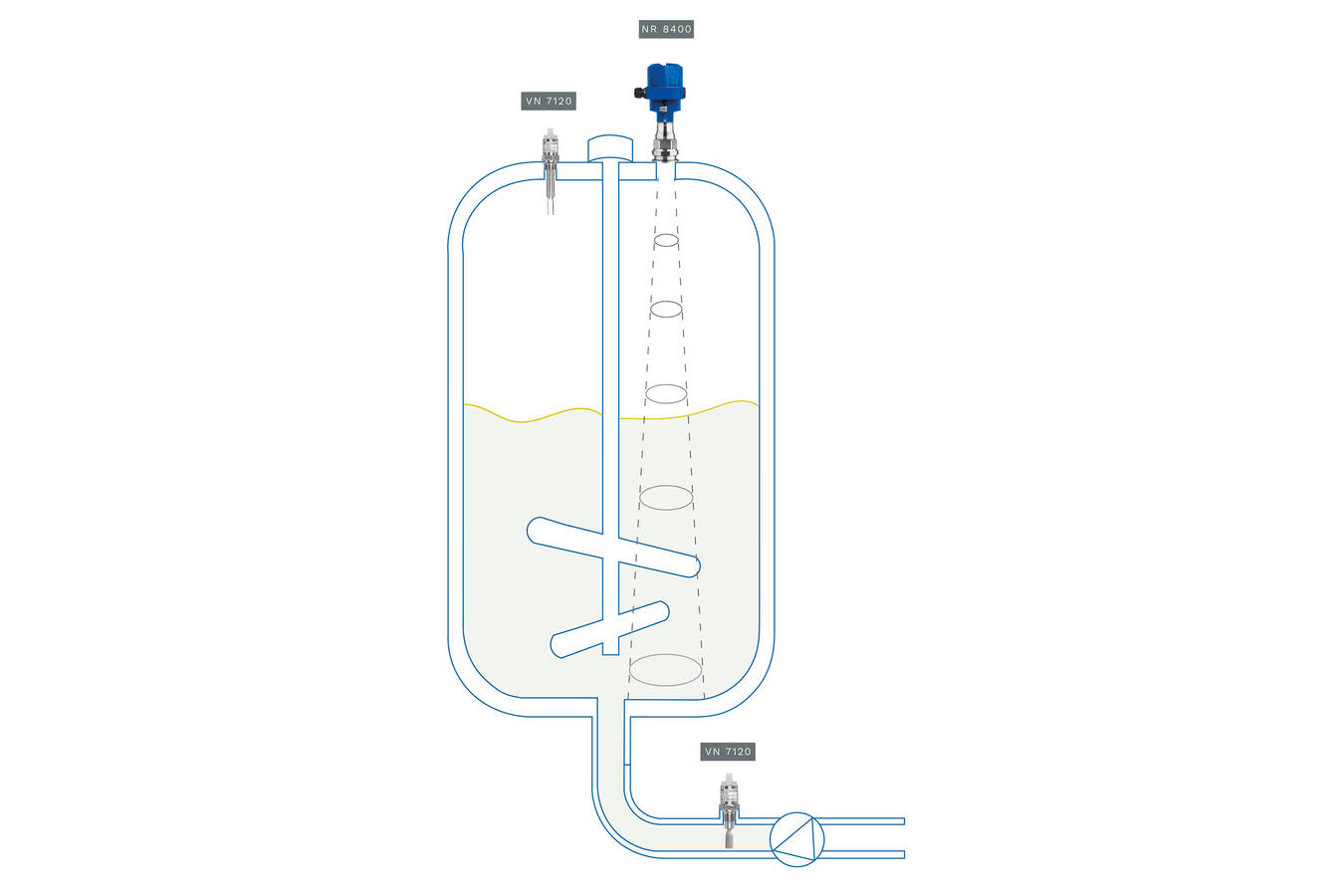 Als Lösung für die Anwendung erfasst ein NivoRadar® 8400 den Füllstand im Tank. Ergänzend übernimmt ein Vibranivo® VN 7120 mit Verlängerung die Detektion der Maximalfüllhöhe. Ein weiterer VN 7120 in Kompaktausführung sichert den Grenzstand im Ablassrohr und gewährleistet damit eine kontrollierte Entleerung.