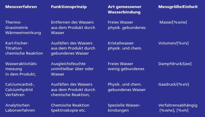 In der Charakterisierung der Online-Messverfahren (Tabelle 2) ist das physikalische Prinzip, nach dem die Messung durchgeführt wird, ein entscheidender Parameter. Damit wird entschieden, welche Bindungsart/Form der Wasseranlagerung im Produkt gemessen wird.