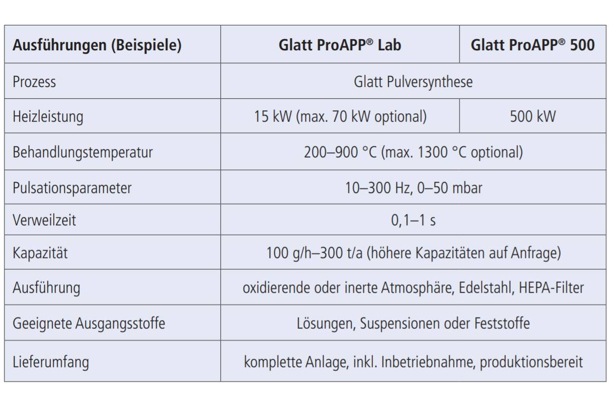 Der Anlagenbauer begleitet seine Kunden von der ersten Idee über die Prozessentwicklung bis hin zum Bau schlüsselfertiger Produktionsanlagen. Im Technologiezentrum von Glatt in Weimar werden Materialien für Forschungsprojekte sowie neuartige Pulver für Kunden entwickelt und in Pulsationsreaktoren produziert (Bild 8, Tab. 1).