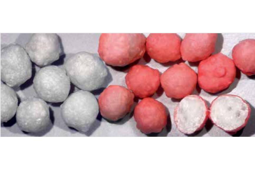 Um Produkte gezielt zu funktionalisieren und mit einem höheren Mehrwert auszustatten, können die Partikel bei Bedarf anschließend mit einer funktionellen Schutzschicht umhüllt werden, zum Beispiel um verschiedene Wirkstoffkombinationen einzustellen. Ein solches Coating schützt aktive Substanzen vor Einflüssen, die bei der Lagerung, dem Transport oder während der Anwendung auftreten können. Der Schutzmantel maskiert aber auch unerwünschten Geruch oder Geschmack, was zum Beispiel bei Insektiziden hilfreich ist, wenn der Köder dem Schädling „schmecken“ soll. Hinzu kommt die Möglichkeit, ein farbiges Branding aufzubringen, damit sich einzelne Komponenten auch optisch unterscheiden (Bild 5). Am interessantesten aber ist die gezielte Freisetzung „controlled release“ bzw. „slow release“ von Wirkstoffen, die an bestimmte Witterungs- und Bodenverhältnisse, Arbeitsschritte und Pflanzenbedürfnisse gekoppelt werden kann.