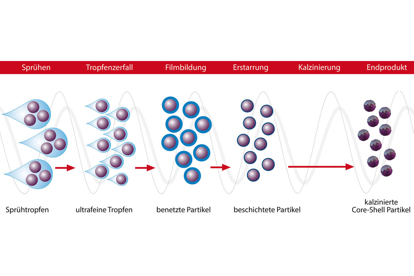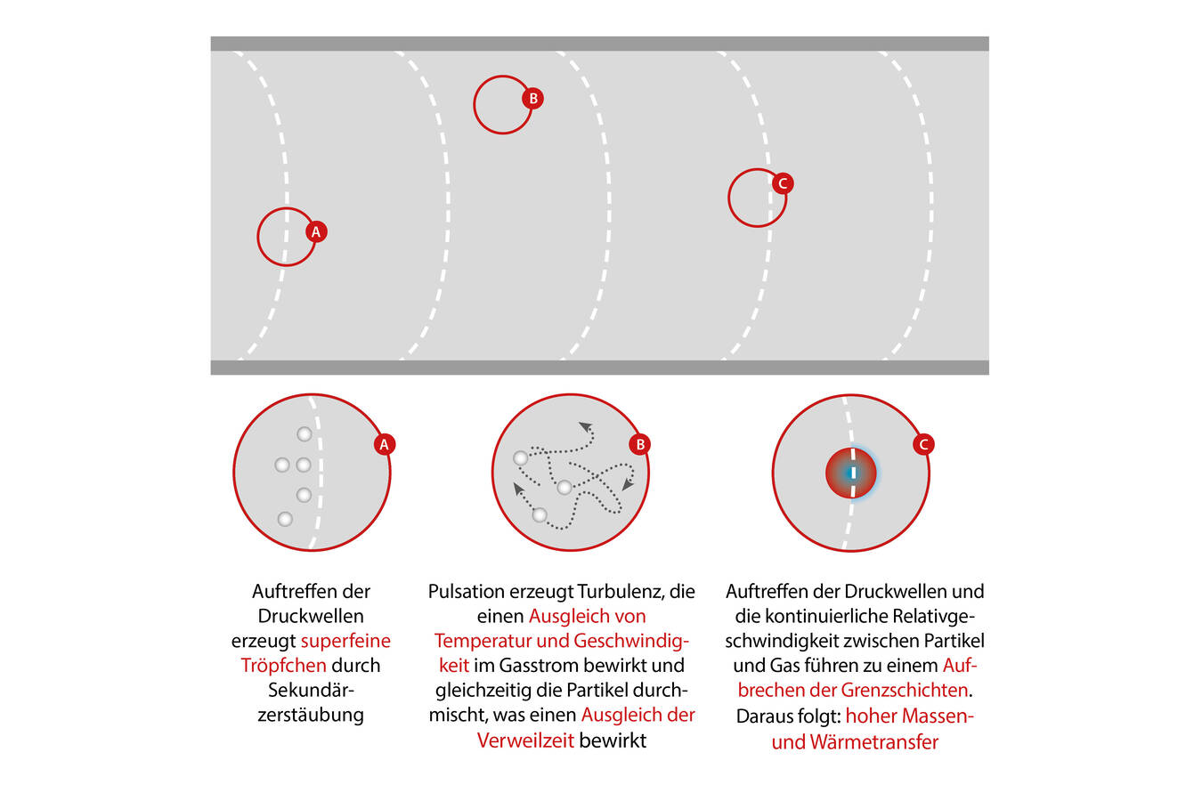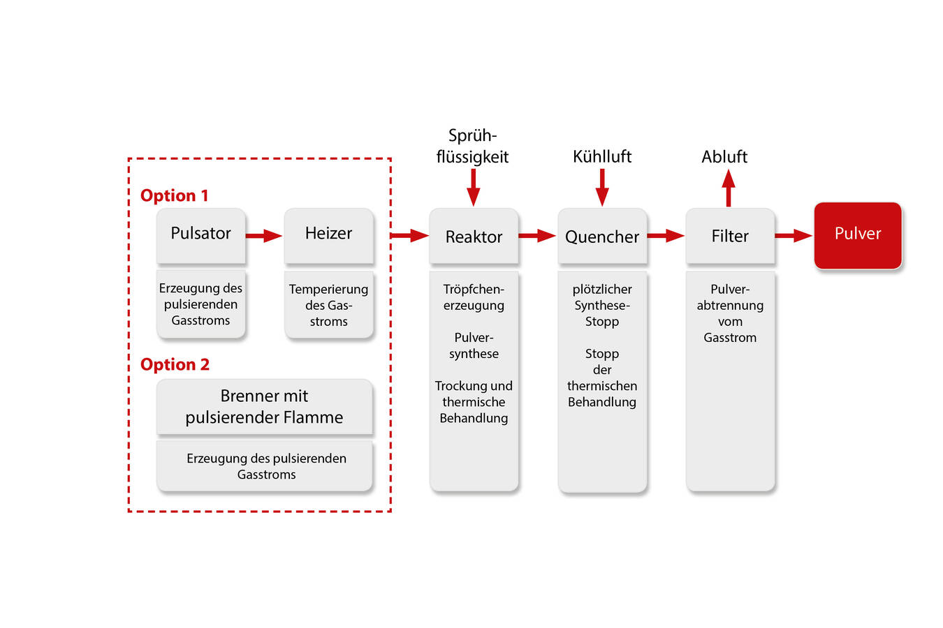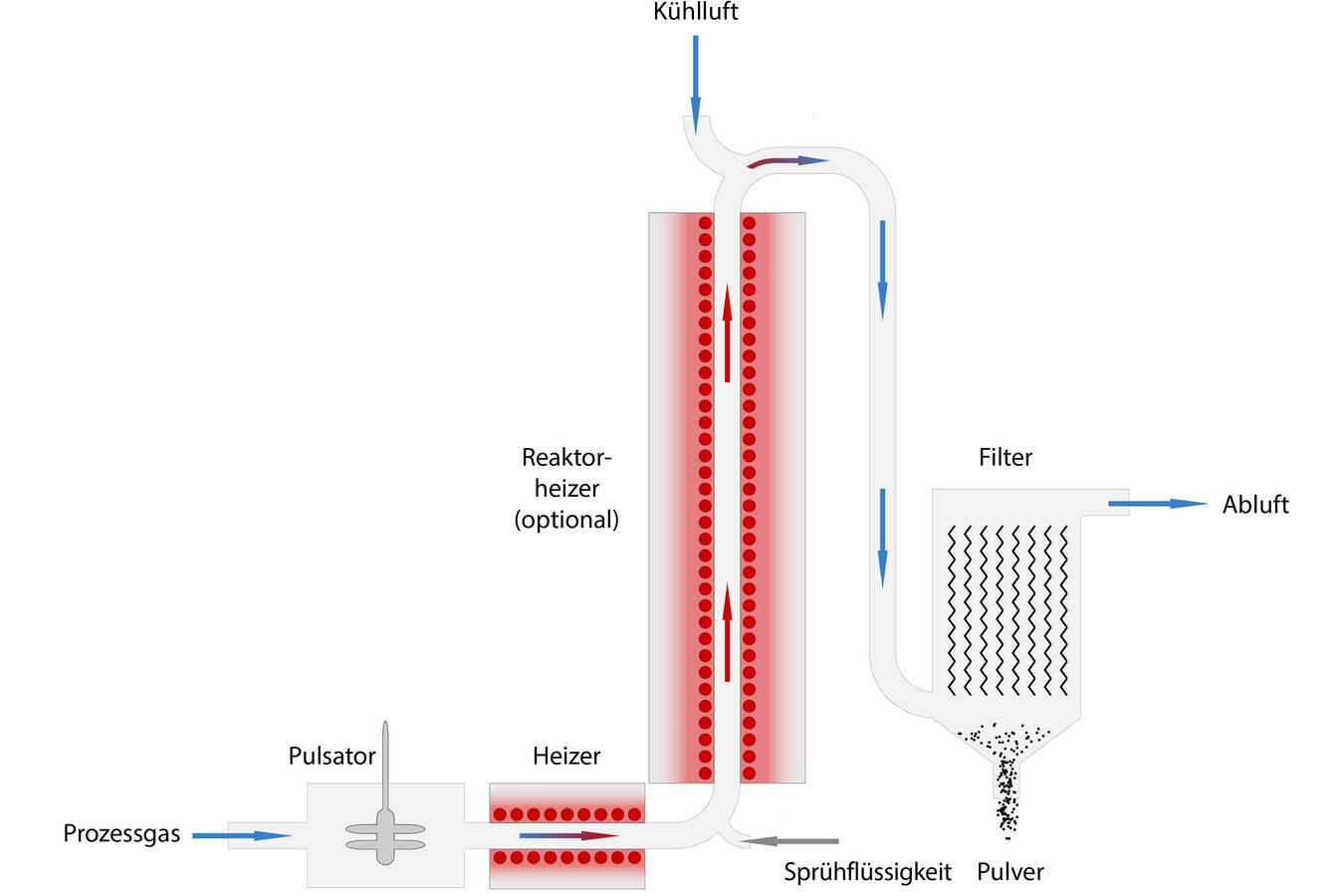 Das Kernelement des Verfahrens ist ein pulsierender Heißgasstrom. Dabei hat die Pulsation einen gravierenden Einfluss auf die Interaktion zwischen dem Gasstrom und dem eingesprühten Material: In einem Reaktor ohne Pulsation bildet sich eine laminare Rohrströmung aus, deren Strömungsrichtung parallel zur Reaktorachse ausgerichtet ist. Die zerstäubten Tropfen werden so lange beschleunigt, bis keine Relativgeschwindigkeit zwischen Gas und Tröpfchen mehr vorliegt. Der dadurch geringere Gasaustausch um Tröpfchen oder Partikel herum führt zur Ausbildung einer Grenzschicht, die sowohl den Wärme- als auch den Stoffaustausch signifikant verzögert. Laminare Strömungen sind darüber hinaus durch ausgeprägte Geschwindigkeits- und Temperaturgradienten über den Reaktorquerschnitt gekennzeichnet: Temperatur und Strömungsgeschwindigkeit nehmen von der Mittelachse des Reaktors zur unbeheizten Wand hin kontinuierlich ab. Aufgrund der fehlenden Strömung orthogonal zur Achse erfolgt keine Durchmischung der Partikel quer zum Reaktor. Die Verweilzeit und die thermische Behandlung der Pulverpartikel hängen dadurch maßgeblich von deren Position im Reaktorquerschnitt ab.