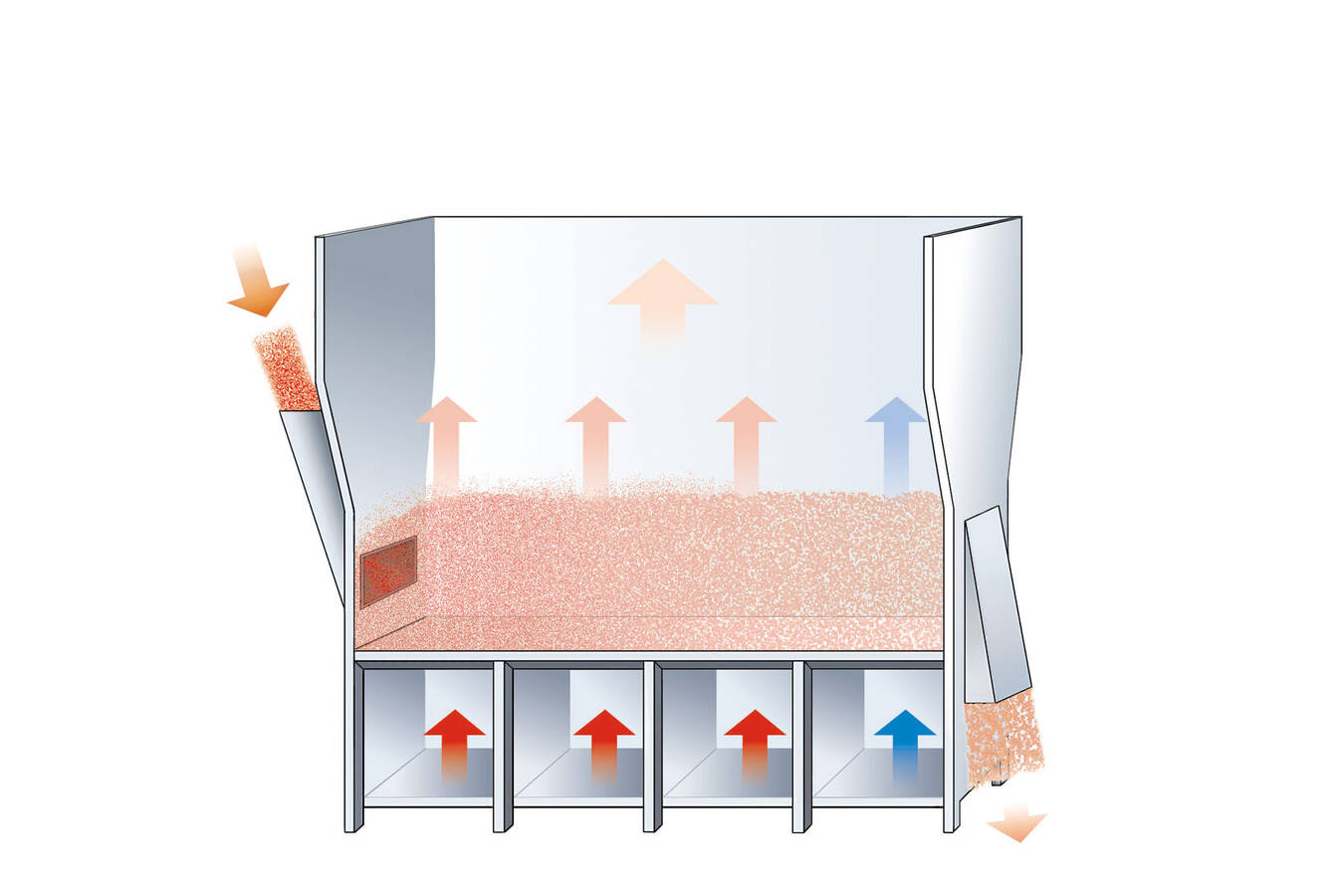 Ein langgestreckter rechteckiger Prozessraum ist hingegen charakteristisch für die Anlagen vom Typ GF, Glatt Fließbett (Abb. 3). Wie bei reinen Trocknungsaufgaben gewährleistet die langgestreckte Geometrie im Bereich der Wirbelschicht eine gerichtete Feststoffströmung zum Austrag hin. Um mehrere Prozessschritte in einem Apparat durchzuführen, wird der Bereich unterhalb des Anströmbodens kammerweise unterteilt. Jede dieser Zuluftkammern kann mit unterschiedlich konditioniertem Prozessgas beaufschlagt werden, das sich beispielsweise durch Luftmengen oder Temperaturen unterscheidet. Der typische Anwendungsfall ist die Sprühgranulation, bei der flüssige Rohstoffe eingedüst und anschließend im austragsseitigen Bereich nachgetrocknet und /oder gekühlt werden (Abb. 4).