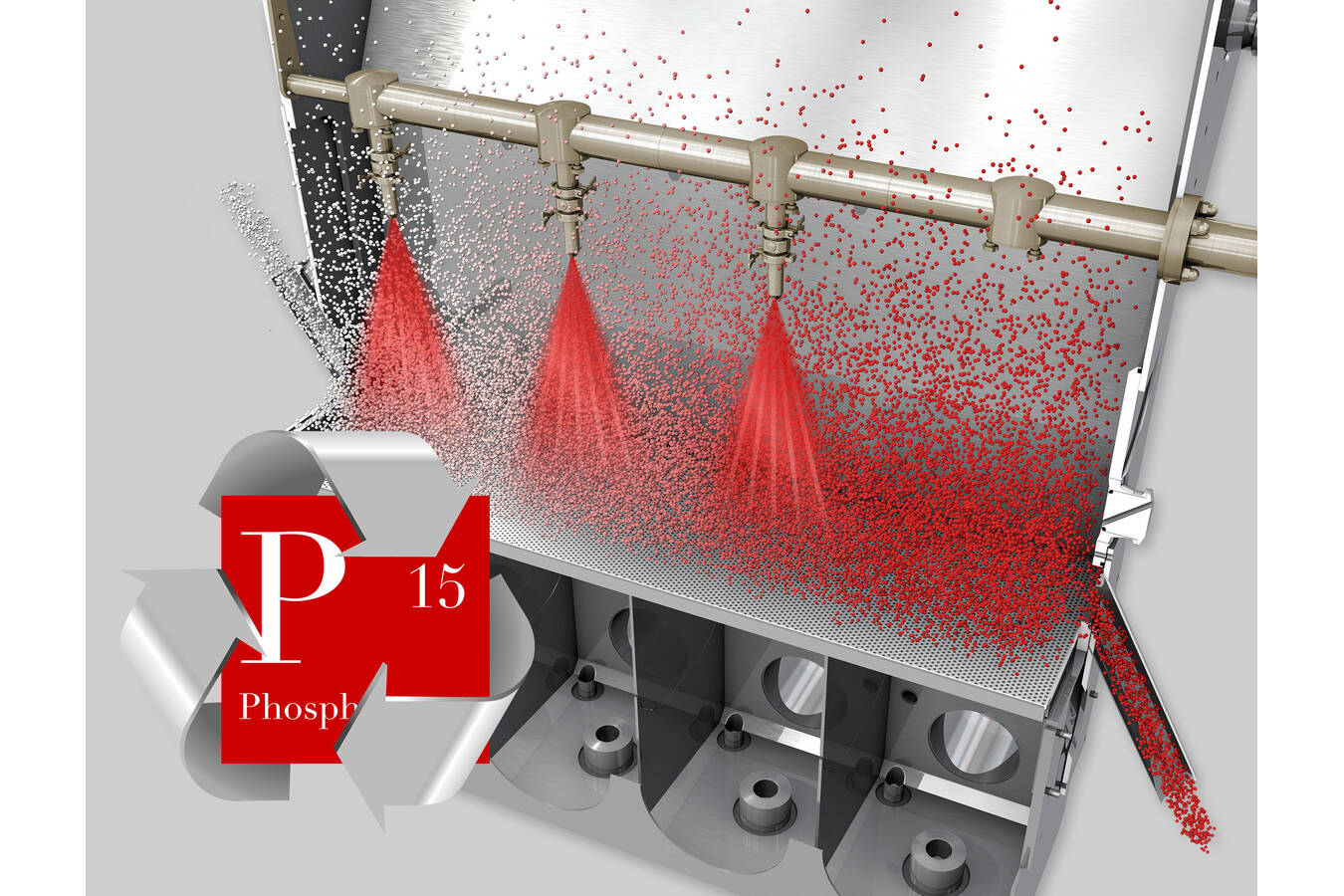 Um die Umwandlungsreaktion einzuleiten, wird aus der phosphathaltigen Asche mit einer Säure eine Suspension hergestellt. Dieser Schritt ist notwendig, um die aschebasierten Nährstoffe pflanzenverfügbar zu machen. Je nach Anwendungsziel können Wasser und weitere feste oder flüssige Nährstoffkomponenten, auch zusätzliche Phosphatquellen, zugesetzt werden. Erst die anschließende Sprühgranulation veredelt das aufgeschlossene Phosphat zu einem marktfähigen Produkt (Abb. 2).