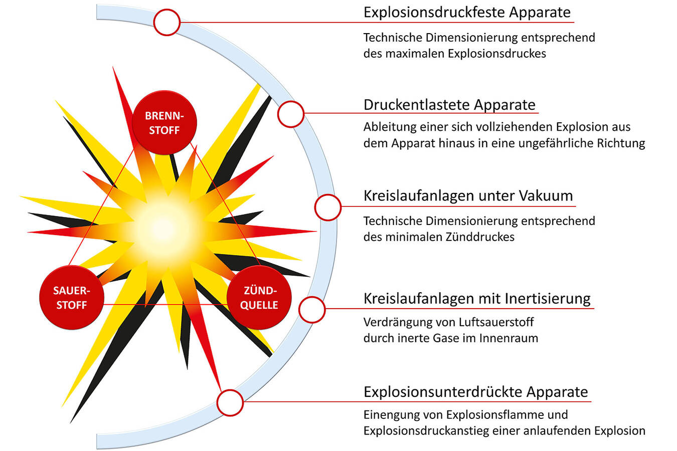Kunden müssen sich auf die Expertise ihres Anlagenbauers verlassen können, insbesondere wenn es die Sicherheit betrifft. Glatt bietet für den Ex-Schutz verschiedene Konzepte an, die nicht nur rechnerisch beurteilt und abgesichert sind, sondern auch in praktischen Explosionsversuchen bestätigt wurden. Um dem Anlagenbetreiber maximale Sicherheit zu garantieren, werden Zündquellen soweit möglich vermieden, alle Teile geerdet und ein entsprechendes Anlagendesign gewählt. Der Kunde kann auf das für ihn beste Konzept zurückgreifen. Eine Anlage alternativ zu einer Explosionsunterdrückung oder Druckentlastung druckfest auf 12 bar auszulegen, ist mit runden Bauformen leicht machbar. Insbesondere bei Gas-Explosionsschutz oder hybriden Gemischen, können die Investitionskosten deutlich geringer ausfallen, wenn man ohne eine aufwendige Kreisgasanlage auskommt. Sind in der Fortluft Lösungsmittel vorhanden ist allerdings eine Abgasreinigung durch Verbrennung oder eine Gaswäsche erforderlich. Anlagen, die nicht druckfest konstruiert und gebaut werden können, wie rechteckige Wirbelschicht- und Strahlschichtanlagen müssen entweder durch eine Explosionsunterdrückungsanlage oder alternativ durch einen Inert-Kreisgasbetrieb geschützt werden, meist unter Verwendung von Stickstoff. (Prozessgas) Die Inertisierung dient dabei nicht nur dem Explosions- und Brandschutz, sondern kann einen zusätzlichen Benefit bei sauerstoffempfindlichen Produkten bieten. Ungesättigte Öle, Beta-Carotine oder reaktive chemische Stoffe werden vor Oxidation geschützt und zeigen eine bessere Langzeitstabilität. Vorteilhaft ist hier, dass der Dauerbetrieb möglich ist und das Lösungsmittel zurückgewonnen werden kann. Dafür sind die Investitions- und Betriebskosten höher als beim Frischluft-Fortluft-Betrieb.