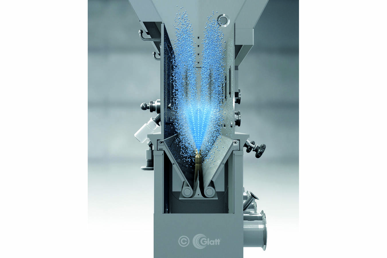 Die eingesetzte Sprühgranulation – insbesondere die Strahlschichttechnologie – bietet gegenüber der herkömmlichen Sprühtrocknung klare Vorteile (Abbildung 2). Durch die kontinuierliche Zerstäubung der Flüssigkeit bilden sich Partikel und wachsen in einem Wirbelbett auf die gewünschte Größe heran. Das Verfahren funktioniert mit Lösungen, Dispersionen oder Emulsionen gleichermaßen. Form, Dichte und andere Eigenschaften können dabei durch Variation der Betriebsparameter eingestellt werden. Bei der Verkapselung von Curcumin führen die kürzeren Verweilzeiten des Verfahrens zu kleineren Partikeln mit einer sehr engen Größenverteilung. Das wirkt sich positiv auf die Löslichkeit aus. Darüber hinaus ermöglicht die gleichmäßige Bewegung der Partikel im Prozess eine optimale Wärmeübertragung und Trocknung der aufgesprühten Suspensionströpfchen. Die erzeugten kugelförmigen Partikel (200 – 600 µm) sind kompakt, staubfrei, frei fließend und gut wasserlöslich.
