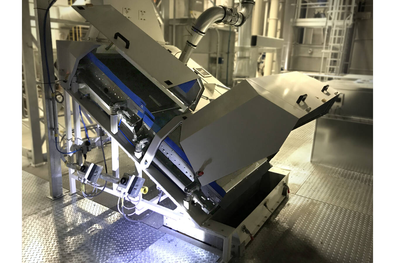 Das Besondere an diesem System ist, dass das Siebdeck nach „x“ Betriebsstunden automatisch gespannt und entspannt werden kann. Es ist sozusagen ein Gummiband, das gespannt wird und beim Spannen / Entspannen eine größere Amplitude verursacht. Keilförmige Flocken, die im Siebdeck stecken geblieben sind, werden vom Deck abgefeuert (sozusagen abgefeuert). Dadurch ist eine Verschlammung des Decks praktisch ausgeschlossen.