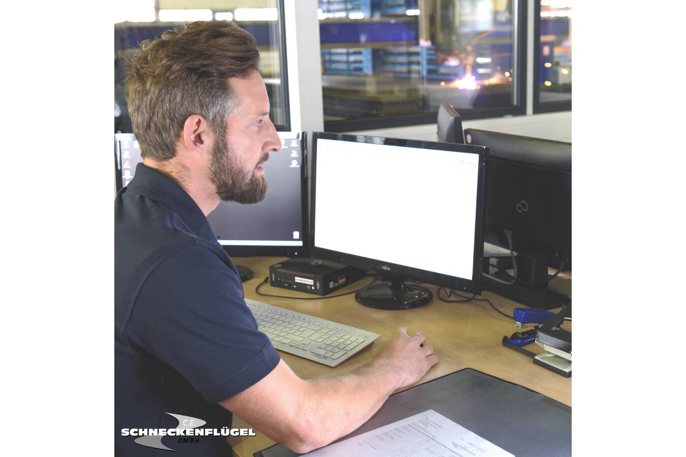 Ein Abstecher ins Büro bildet die nächste Station auf dem Weg vom Blech zum Flügel: Unmittelbar nach dem Auftragseingang werden die Spezifikationen der bestellten Bauteile in unser System eingepflegt. Auf der Basis dieser Werte werden die benötigten Schneckenflügelsegmente berechnet und der Zuschnitt der Einzelteile wird geplant. Das Verschachtelungsprogramm BLECHCENTER optimiert den Zuschnitt und reduziert den Verschnitt auf ein Mindestmaß. Woher wissen wir, wann wir einen Auftrag starten müssen, um einerseits den Liefertermin unseres Kunden einzuhalten und andererseits die Maschinen bestmöglich auszulasten? Das verrät uns das Machine Management System FactoryWare MMS der Firma Eckelmann AG. Diese flexible und intelligente Cloud-Anwendung erschließt, digitalisiert und analysiert die Produktionsdaten und macht die Effizienz der Abläufe sichtbar. So lassen sich Prozesse wie unsere effiziente Maschinenauslastung smart steuern. Dies hat nicht nur eine deutliche Zeitersparnis und eine hohe Planungssicherheit im Produktionsprozess zur Folge, sondern sorgt auch für unsere präzise Materialplanung: Durch die optimale Verschachtelung der Zuschnitte auf dem Stahlblech wird der Verschnitt minimiert und die Fläche des Rohmaterials bestmöglich ausgenutzt.