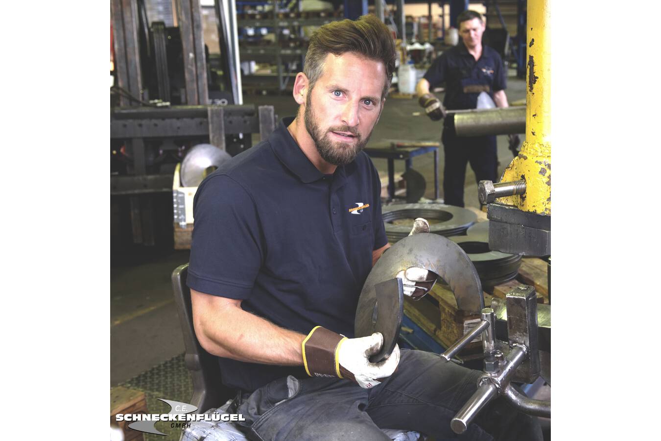 Im nächsten Schritt bekommen die Rohlinge ihre Flügel-Form. Mit unseren insgesamt acht sehr unterschiedlichen Pressen fertigen wir die ganze Vielfalt an Schneckenflügel-Segmenten. Für die ganz großen Flügel wurde bei C.E. Schneckenflügel eigens eine besonders leistungsstarke Maschine konzipiert und gebaut. So können wir eine große Bandbreite an Spezifikationen erfüllen und Schneckenflügel für die verschiedensten Verwendungszwecke herstellen. Das Pressen der Flügel ist ein echtes Handwerk: Jeder Rohling wird einzeln von den Mitarbeitern mit viel Fingerspitzengefühl zum Flügelsegment geformt. Wie in allen Produktionsprozessen bei C.E. Schneckenflügel arbeiten auch hier Menschen und Maschinen im Einklang miteinander. Karl-Heinz Gerdes, unser langjähriger Fertigungsleiter, beschreibt die Arbeit an den Pressen: