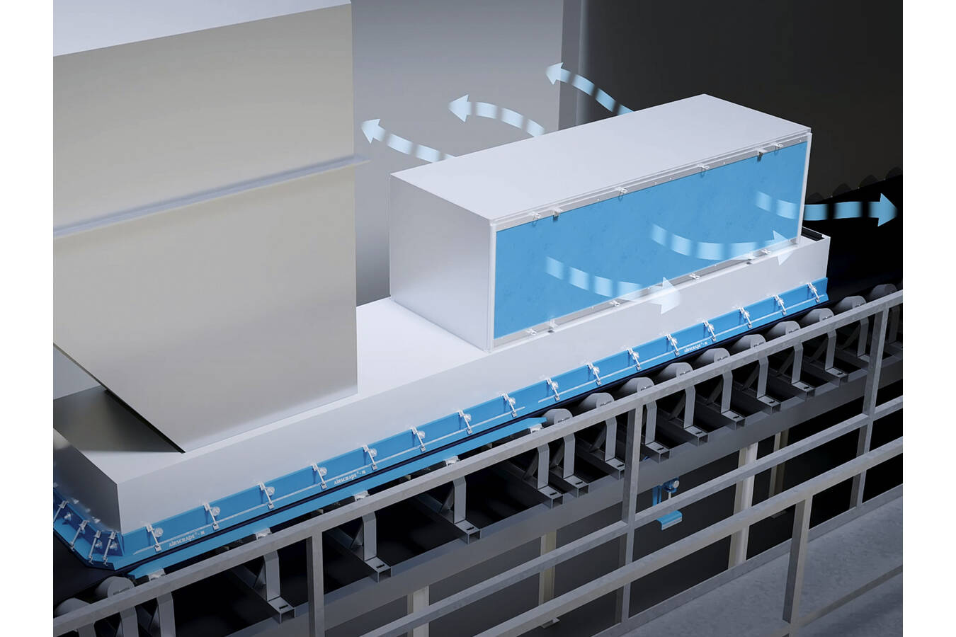 Das berührungslose AirScrape-Förderband-Dichtsystem ist eine äußerst effektive Seitenabdichtung, die ohne Kontakt über dem Förderband liegt und aufgrund ihrer speziell gestalteten Lamellenstruktur einen Unterdruck erzeugt. Über den einmal einstellbaren geringen Spalt zwischen AirScrape und Gurt wird dauerhaft Luft eingezogen. Das hat zur Folge, dass kein Staub von innen nach außen gelangen kann. Da dieses System frei über dem Förderband schwebt, werden Reibung an der Abdichtung und Schäden am Band vermieden, wodurch die Lebensdauer jeder Komponente des Förderbands verlängert wird.