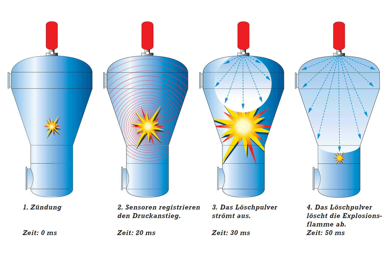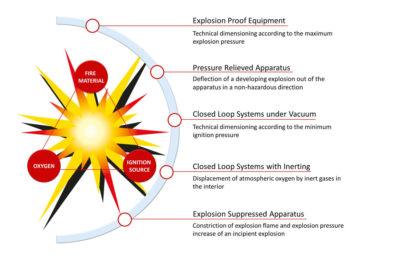 Glatt bietet verschiedene explosionsverhütende Vorrichtungen und Maßnahmen an, die nicht nur rechnerisch beurteilt, sondern auch in praktischen Explosionsversuchen bestätigt wurden. Zündquellen werden soweit möglich vermieden, alle Teile geerdet und ein entsprechendes Anlagendesign gewählt, um maximale Sicherheit zu gewährleisten. Kunden können auf das für sie beste Konzept zurückgreifen, sei es eine Explosionsunterdrückung, Druckentlastung, Inert-Kreisgas- oder Vakuum-Betrieb.