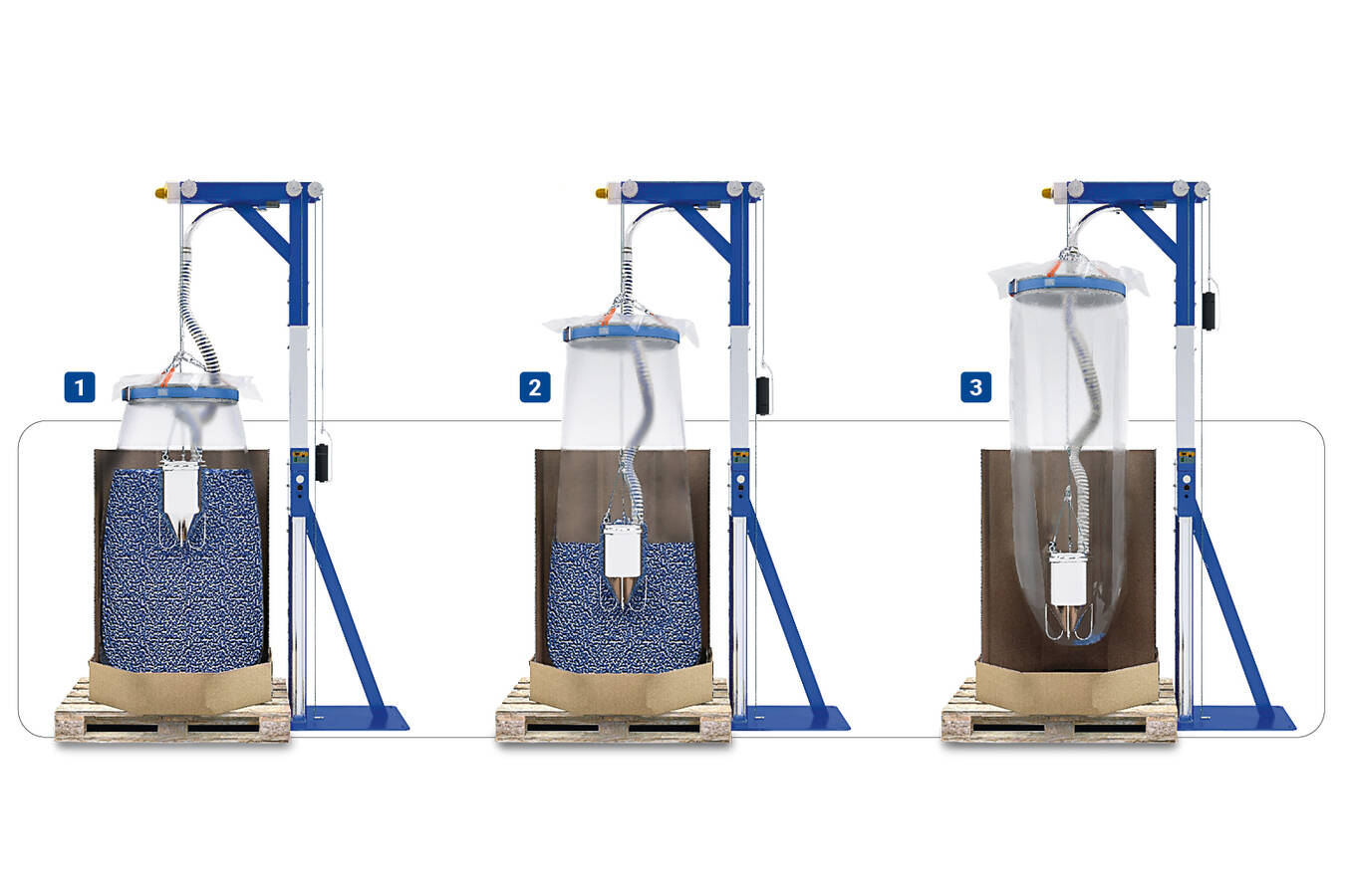 Kern dieser wartungsfreien Technologie ist die Verwendung des OKTOMAT®-Absaugkopfes anstelle einer Sauglanze bei gleichzeitiger Straffung der Folie oder der Gebindewand durch die OKTOMAT®-Vorrichtung. Für den Gebindewechsel ist lediglich ein Handhubwagen notwendig.