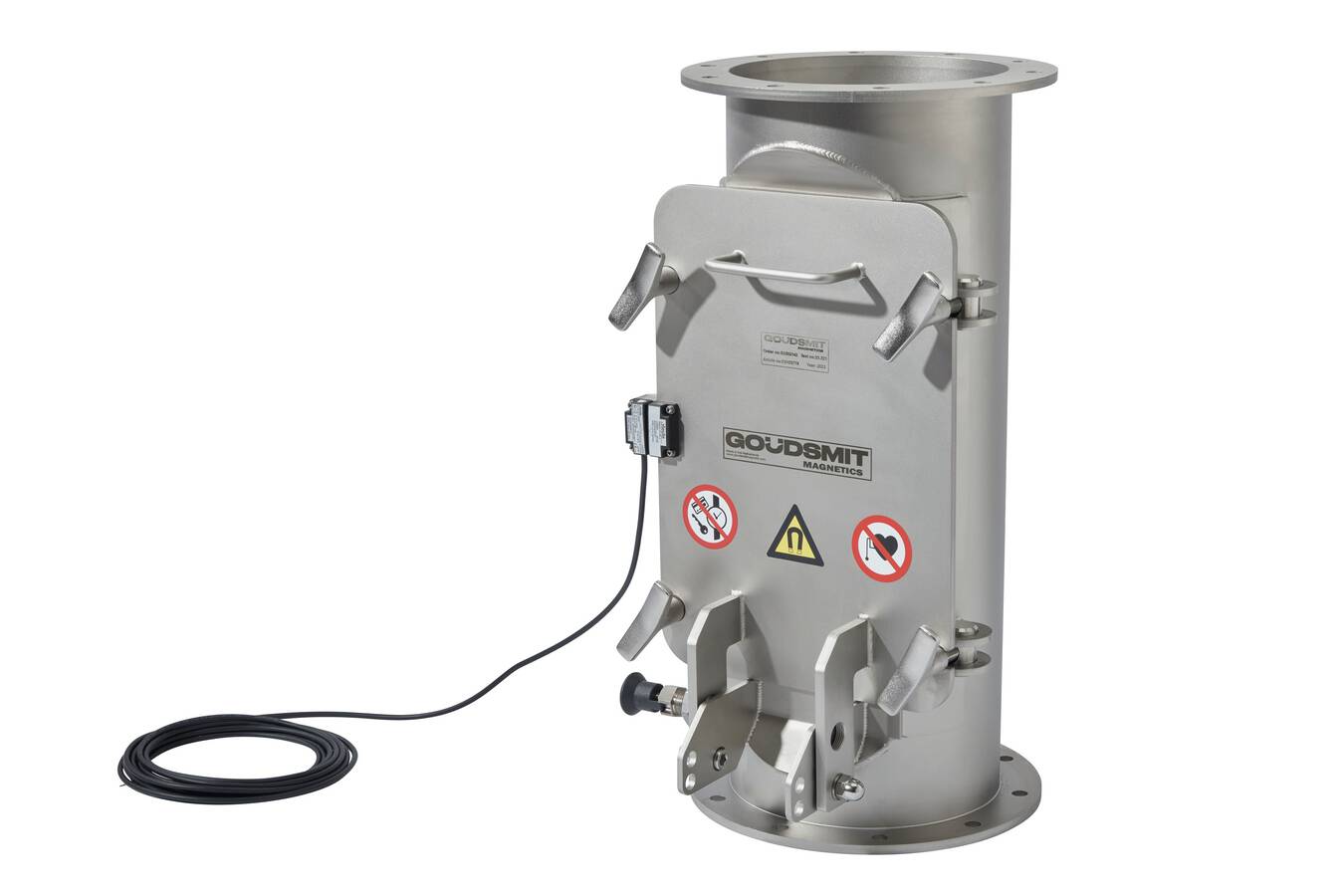 Trotz seines starken Permanentmagnetkerns ist der Magnet leicht zu reinigen. Durch die Tür mit vertikaler Aufhängung ist die Überprüfung auf Verunreinigungen ein Kinderspiel. Der Magnet lässt sich von Hand oder mit einem Schaber öffnen und reinigen. Kleinere Metallteile, wie z. B. Kugeln oder abgebrochene Gewinde, lassen sich leicht über die konische Oberseite des Magnetkerns schieben und dann entfernen. Dies stellt eine Verbesserung gegenüber früheren Versionen dar. Um zu verhindern, dass der Magnet während des Produktionsprozesses geöffnet wird, kann der Edelstahl-Rohrmagnet mit einem Sicherheitsschalter ausgestattet werden.