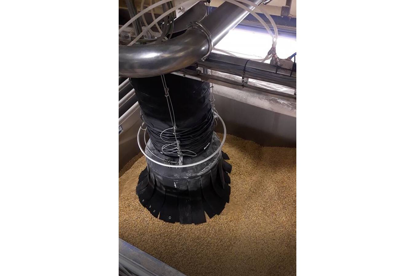 Beim Beladen von Schiffen strömt das Produkt aus großer Höhe in ein Laderohr und gewinnt dabei stark an Geschwindigkeit. Wenn der Materialstrom mit dem Produktberg im Laderaum des Schiffes zusammenstößt, wird eine Menge Energie frei. Dies führt zu einer heftigen Bewegung des Materials, die eine Menge Staub aufwirbeln kann.