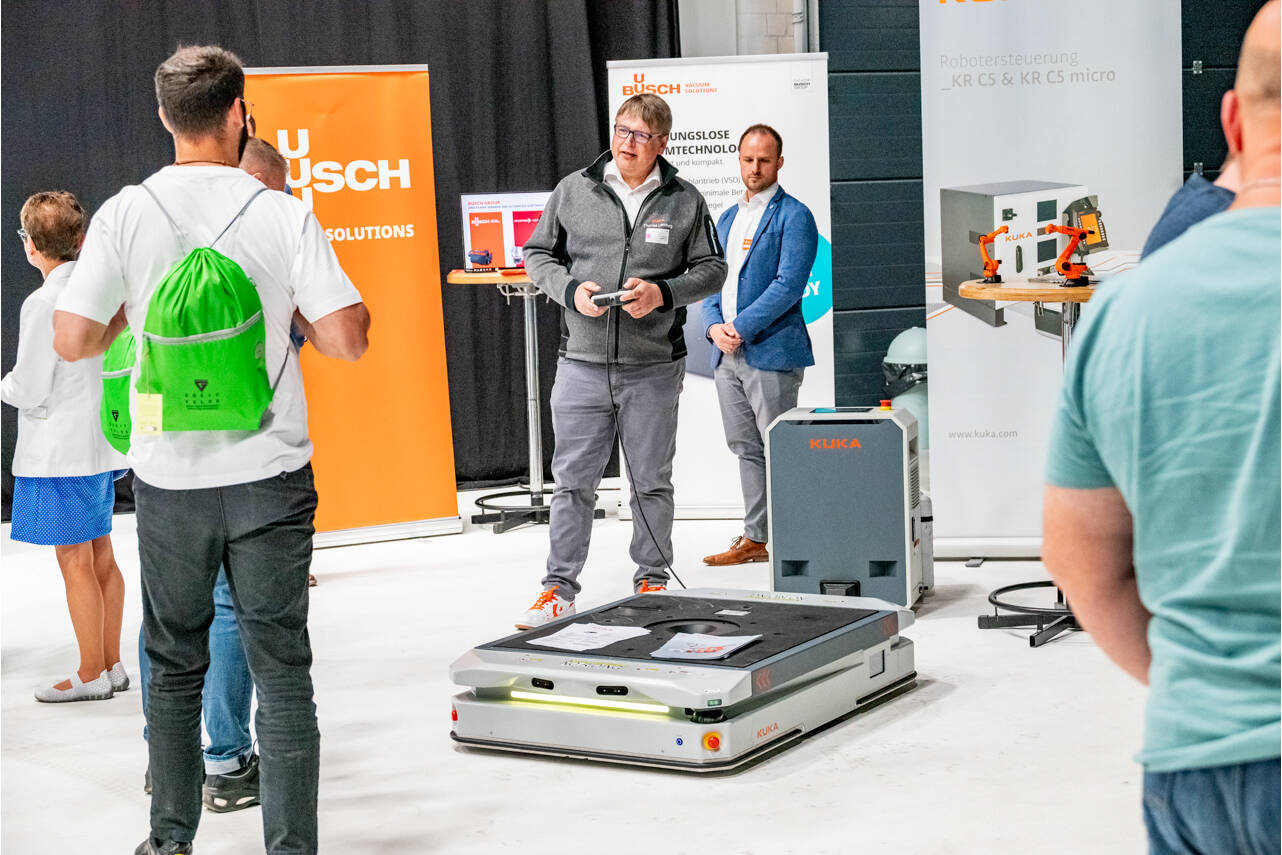 Parallel zur Werksführung wartete in den nahegelegenen Exvoli Studios eine Innovationsmesse: Unsere Technologiepartner zeigten dort aktuelle Entwicklungen, digitale Lösungen sowie Live-Demonstrationen, darunter KUKA AMR-Robotik-Innovationen, Riedel Filtertechnik mit Lösungen zur Abluftreinigung, Hecht Technologie mit kompletter Roadshow, Bluhm Systeme mit Live-Etikettierern, Markem-Imaje mit Laser-Kennzeichnung sowie Interroll, Busch Vacuum Solutions und dy-pack mit weiteren Systemlösungen. Die Vielfalt zeigte: Zukunftsweisende Verpackungslösungen entstehen gemeinsam im starken Verbund.