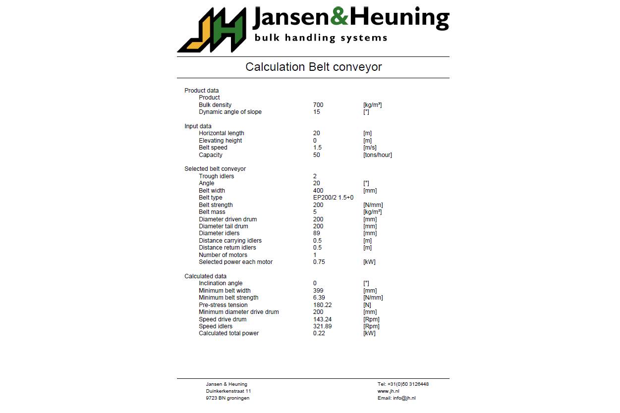 Das Berechnungsprogramm ist für jeden kostenlos nutzbar und erfordert keine Anmeldung. Beginnen Sie noch heute mit der Auslegung Ihres Fördersystems. Benötigen Sie Unterstützung? Das Ingenieurteam von Jansen&Heuning steht Ihnen gerne zur Verfügung.