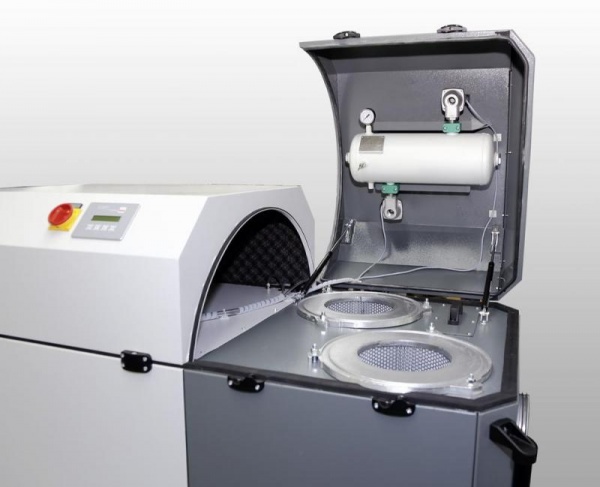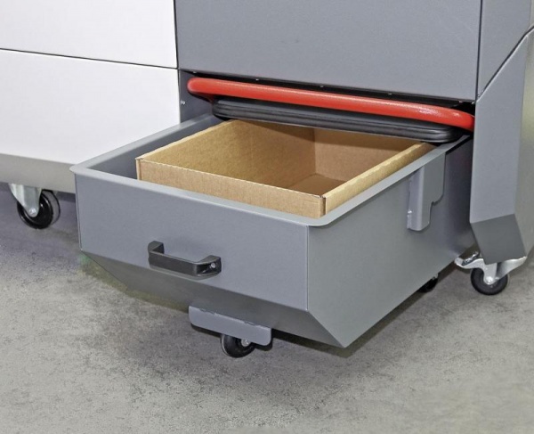 Der integrierte Prallabscheider zur Vorabscheidung grober und schwerer Partikel sorgt für lange Filterstandzeiten der beiden Filterpatronen. Die differenzdruckgesteuerte Jet-Pulse-Filterreinigung löst den an der Patronenaußenseite anhaftenden Staub, welcher im Anschluss in den Sammelbehälter fällt. Eine fahrbare 90-Liter Staubsammelschublade kann mit Hubwagen oder Stapler transportiert werden.
