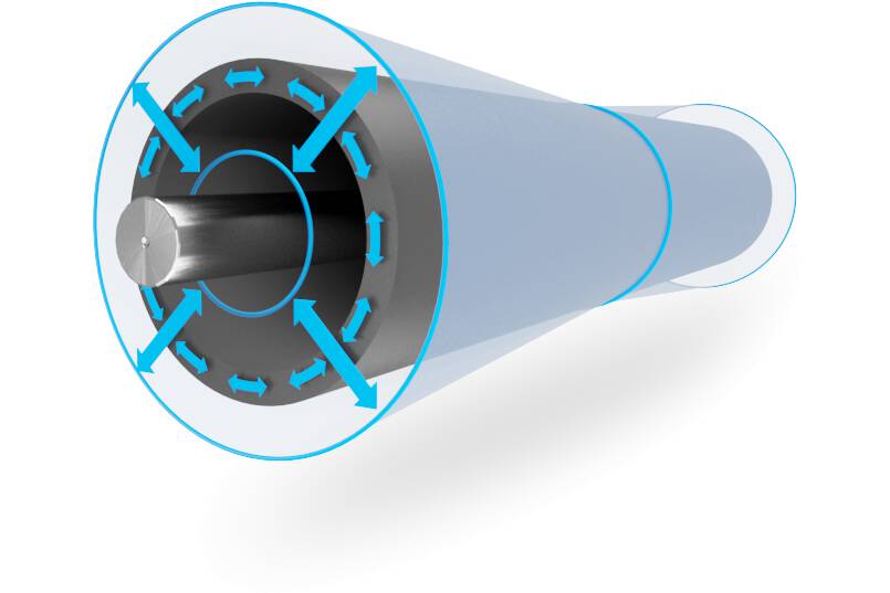 Da der PrimeTracker über seine komplette Breite den gleichen Durchmesser aufweist, hat er stets einen vollständigen Kontakt zum Gurt. Verschleiß am Rand wird verhindert, Gurt und Tracker werden mit einer längeren Lebensdauer be- lohnt. Zur Lebensdauer trägt außerdem ein Gummizentrallager und eine Manschettenabdichtung zur weichen Aufhängung der Tracker-Welle positiv bei.