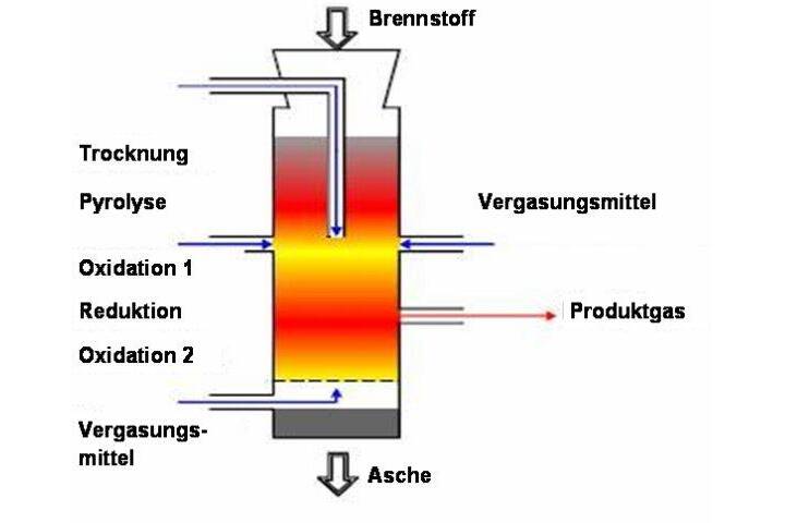 Die thermochemische Vergasung stellt den zentralen Prozess im Verfahren dar. Das Herzstück der Vergasung ist ein Doppelfeuervergasungsreaktor, in dem Hackschnitzel verkokst werden. Dabei werden im Reaktor verschiedene Zonen durchlaufen. Die Hackschnitzel werden in der Trocknungszone von 10-15% atro auf 0% Brennstoff-Feuchte getrocknet, in der Pyrolysezone erfolgt unter Luftabschluss die thermisch induzierte, pyrolytische Zersetzung der Makromolekühle (Zellulose, Hemizellulose und Lignin), aus denen die Hackschnitzel bestehen. Übrig bleibt fester Pyrolysekoks bestehend aus Kohlenstoff und Asche. In der Oxidationszone (bis > 1.000°C / 1832°F) wird die für die Vergasung und Pyrolyse benötigte Wärmeenergie durch eine Teilverbrennung der Pyrolyseprodukte erzeugt. Als Vergasungsmittel wird Luft verwendet. Der Hauptteil der brennbaren Bestandteile des Produktgases wird in der Reduktionszone gebildet. Wasserdampf und Kohlenstoffdioxid werden mit festem Kohlenstoff zu Wasserstoff und Kohlenstoffmonoxid reduziert.