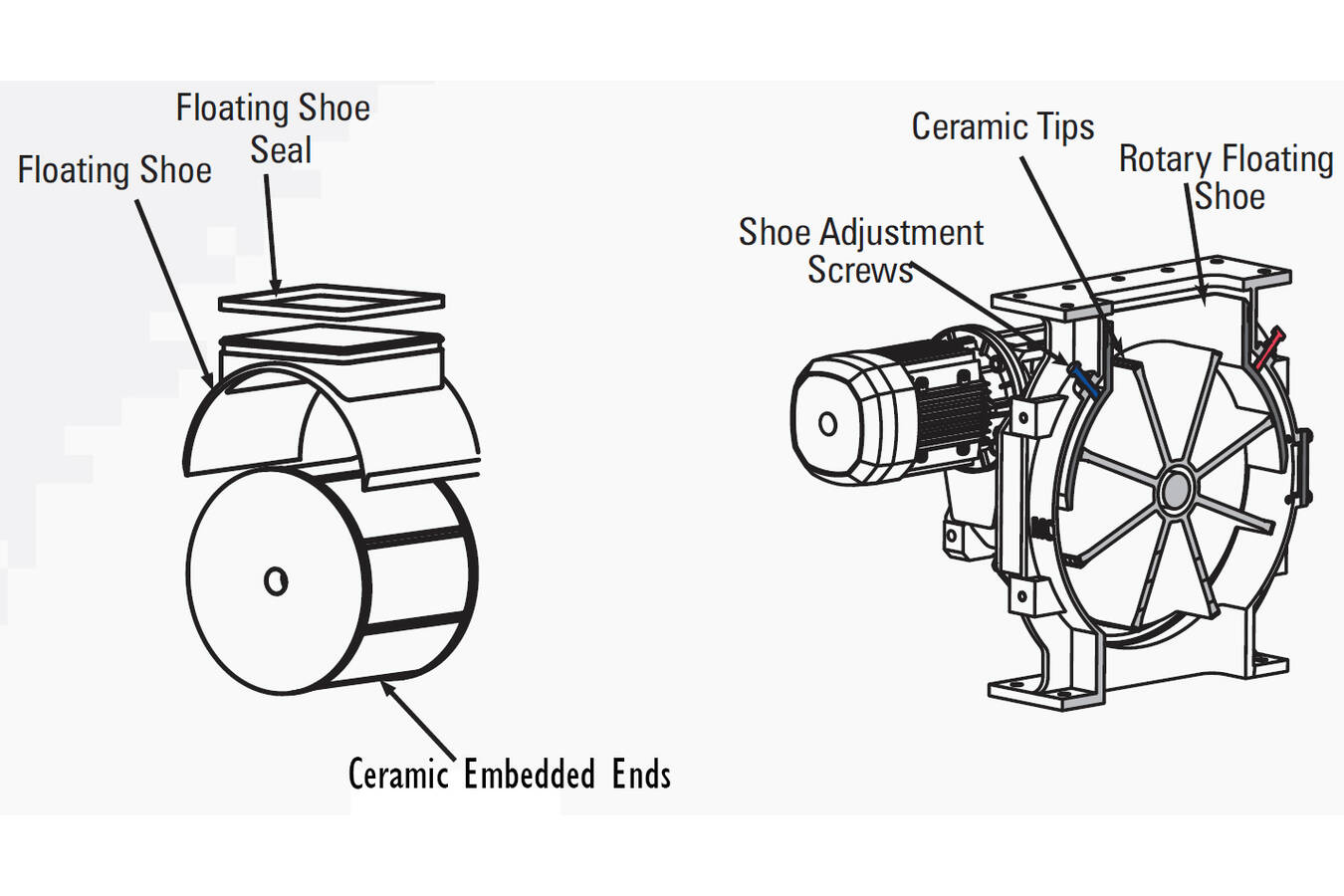 Die Ventile der Serie RFS, die aus einem Gussgehäuse mit angeschraubten Seitenplatten und einem mit Stegen versehenen Rotor bestehen, können sowohl in Über- als auch in Unterdruckanwendungen eingesetzt werden. Diese Ventile sind so konstruiert, dass sie durch den Einsatz von "Floating Shoe" eine zusätzliche Dichtungsleistung bieten, um selbst das abrasivste Material zu transportieren und trotzdem eine längere Lebensdauer im Vergleich zu ihren Konkurrenten zu haben.