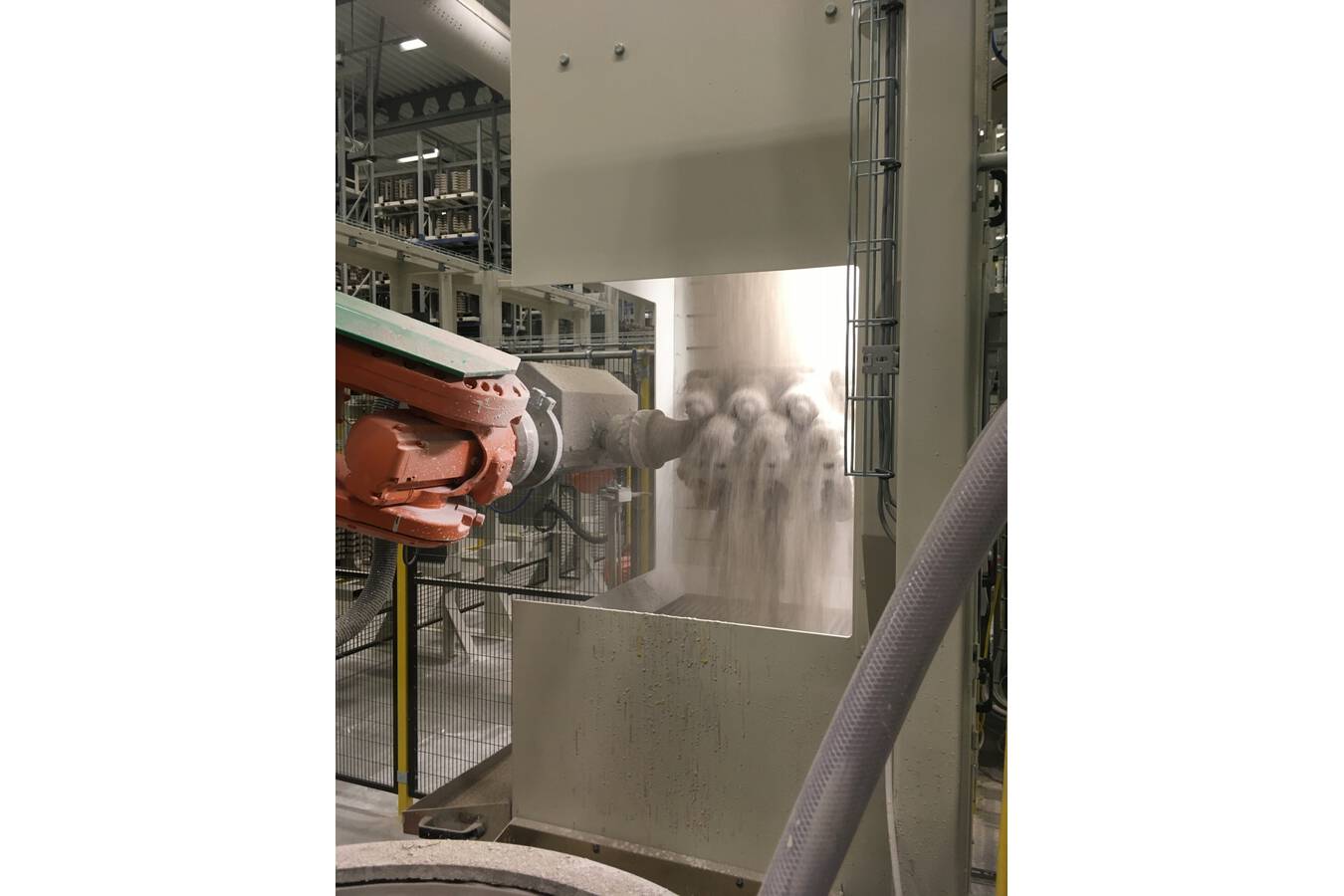 Einer der vielen Prozessschritte beim Wachsausschmelzverfahren besteht darin, dass ein ”Wachsbaum” - der aus einer Reihe von Wachsformen besteht - mit einer Keramikschicht überzogen wird, um schließlich ein Gussergebnis zu erzielen. Der Wachsbaum wird in einen Schlamm getaucht, angehoben und dann mit einem Keramikpulver (einer Art Sand) bestäubt, gefolgt von einem Trocknungsprozess. Dieser Zyklus wiederholt sich sieben bis neun Mal. Schließlich wird ein feuerfester, keramischer Mantel um die Gussformen gebildet. Dieser Prozessschritt wird vollautomatisch von Robotern durchgeführt.