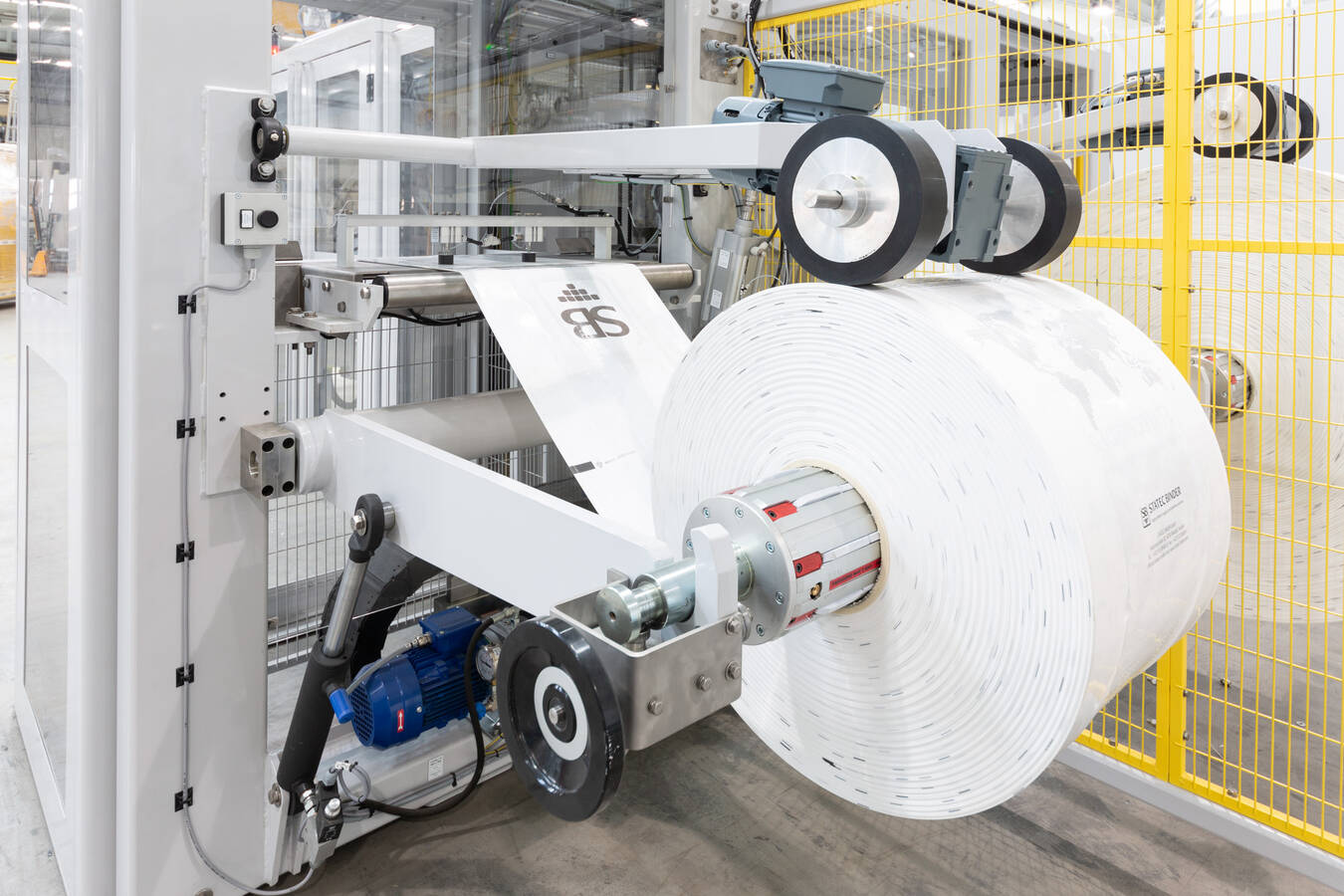 - Die Schlauchfolie wird mit Hilfe einer Tänzerrolle/Ausgleichswippe zur ersten Schweißleiste gezogen, wo der Boden des Beutels verschweißt wird und ein Messer den einzelnen Beutel von der Rolle schneidet.