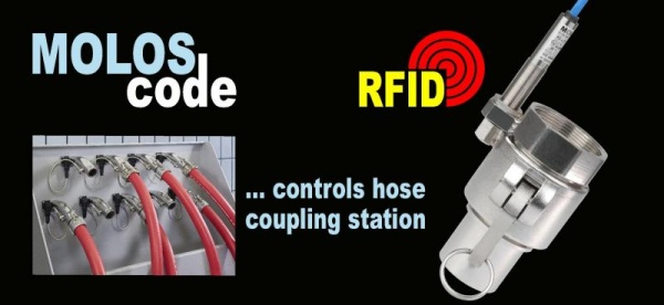 Mit MOLOScode kann jedes gängige Kupplungs-System in eine Kupplung 4.0 verwandelt werden. Diese elektronisch codierten Kupplungen mit RFID-Technologie ermöglichen auch die sichere Unterscheidung zwischen Produkt- und Spülanschluss und die Automatisierung des kompletten Schlauchmanagements. Die Überwachung der Kontamination von Schläuchen oder von Schlauch-Wartungsterminen kann bequem über das Prozessleitsystem erfolgen. Auch bei ineinander verschlungenen Schläuchen behält man mit MOLOScode einfach die Übersicht.