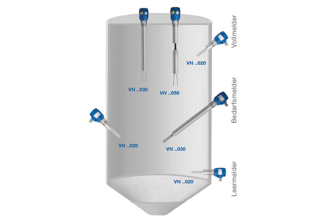 Um in Mehlvorbehältern zu Verladeteleskopen eine Leermeldung zu realisieren wurde die Schwinggabel VN 1020 aus der Vibranivo® 1000 Serie mit kurzem Ausleger eingesetzt. Dabei musste besonders die starke statische Aufladung der Kunststoffbehälter während der Befüllung berücksichtigt werden. Für eine störungsfreie Produktion und einen reibungslosen Verladeablauf der Mehlsorten in die LKWs wurde die Gabel daher mit verstärkt robuster Bauform sowie speziell abgesicherter Elektronik designt. Die kurze Bauform des VN 1020 ermöglicht prinzipiell einen optimalen Einsatz in Behältern mit beengten Raumverhältnissen, beispielsweise auch im Verladeteleskop als Vollmelder oder in Fallrohren als Rückstaumelder.