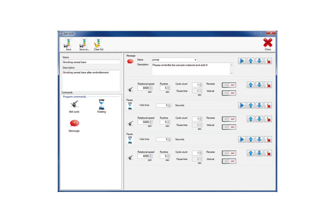 Mit der Software P-11Control kann die Mühle über den USB Anschluss gesteuert, bis zu 20 SOPs direkt am angeschlossenen Laptop per Drag & Drop editiert, gespeichert und verwaltet werden. Mit dem integrierten Reportgenerator können Sie schnell und einfach Mahlreports revisionssicher erstellen und archivieren.