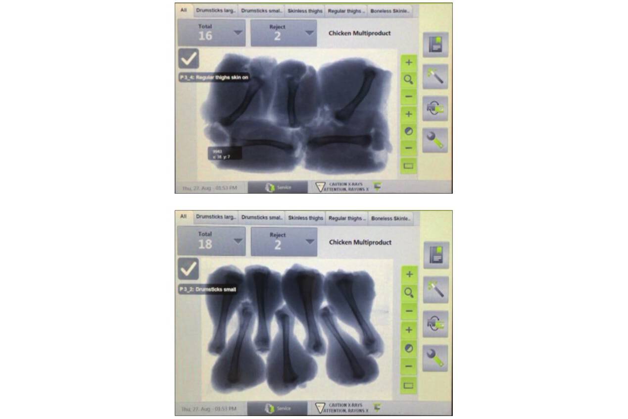 Ein weiteres Anwendungsgebiet für moderne Röntgeninspektionssysteme ist die Erkennung von Kunststoffen. Es ist durchaus bekannt, dass Röntgensysteme nicht alle Kunststoffe als Fremdstoffe erkennen können. Viele Medizinprodukte und Arzneimittel werden jedoch verpackt bzw. aus Kunststoffbehältern dosiert. Abbildung 3 zeigt eine Fertigspritze mit korrekter Länge in einem Karton, und eine andere die eingedrückt wurde. Mit Röntgentechnik kann die Länge der Spritze gemessen werden und eine mögliche Drehung oder Schrägstellung zur besseren Genauigkeit erkannt werden. Spritzen mit falscher Länge können aussortiert werden. Da eine falsche Länge eine Abweichung von der korrekten Dosis bedeutet, wird mit einem Röntgensystem die Produktintegrität sichergestellt, wozu kein anderes System in der Lage Viele Produkte können chaotisch vorgelegt werden oder kombiniert sein und innerhalb einer Verpackung wahllos zusammengefügt werden. Bei einem Röntgensystem kann die beste Erkennungsleistung erreicht werden, wenn man produktspezifische Einstellungen verwendet. Es können zwar verschiedene Produkte mit einer einzigen Einstellung untersucht werden, eine solche Einstellung ist jedoch oft nur ein Kompromiss, der bei einem Produkt zu einer schlechteren Erkennungsleistung führt oder zu einer höheren Rate von Fehlausscheidungen. Ein mit neuester Softwaretechnik ausgestattetes Röntgensystem kann chaotisch angeordnete oder mehrere unterschiedliche Produkte beim Durchlaufen der Röntgenstrahlen automatisch erkennen. Abbildung 4 zeigt Hähnchenkeulen und –schenkel, die typischerweise auf einer Verpackungslinie wahllos verpackt werden. Die Software zeigt die erkannten Produkte auf dem Bildschirm an.