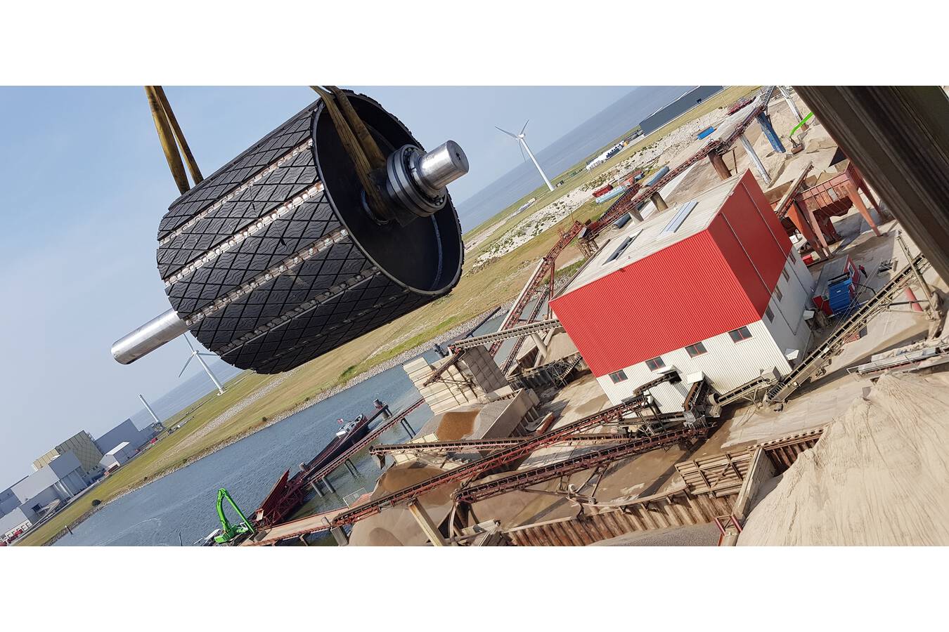 Die Antriebstrommel und der Reibbelag waren in einem schlechten Zustand. Die Trommel war anfällig für Verunreinigungen, die Gurtschieflauf verursachten. Muller Beltex baute eine neue Trommel mit einem auswechselbaren Reibbelag ein. Der Belag bietet guten Gripp für den Gurt und durch sein besonderes “Winterreifenprofil“ werden Verunreinigungen gut abgeleitet. Der Belag schützt die Trommel vor Verschleiß und kann ohne Ausbau der Trommel ausgewechselt werden. Außerdem wurden die Trommellager gewechselt und ein neuer witterungsbeständiger SEW-Antrieb eingebaut.
