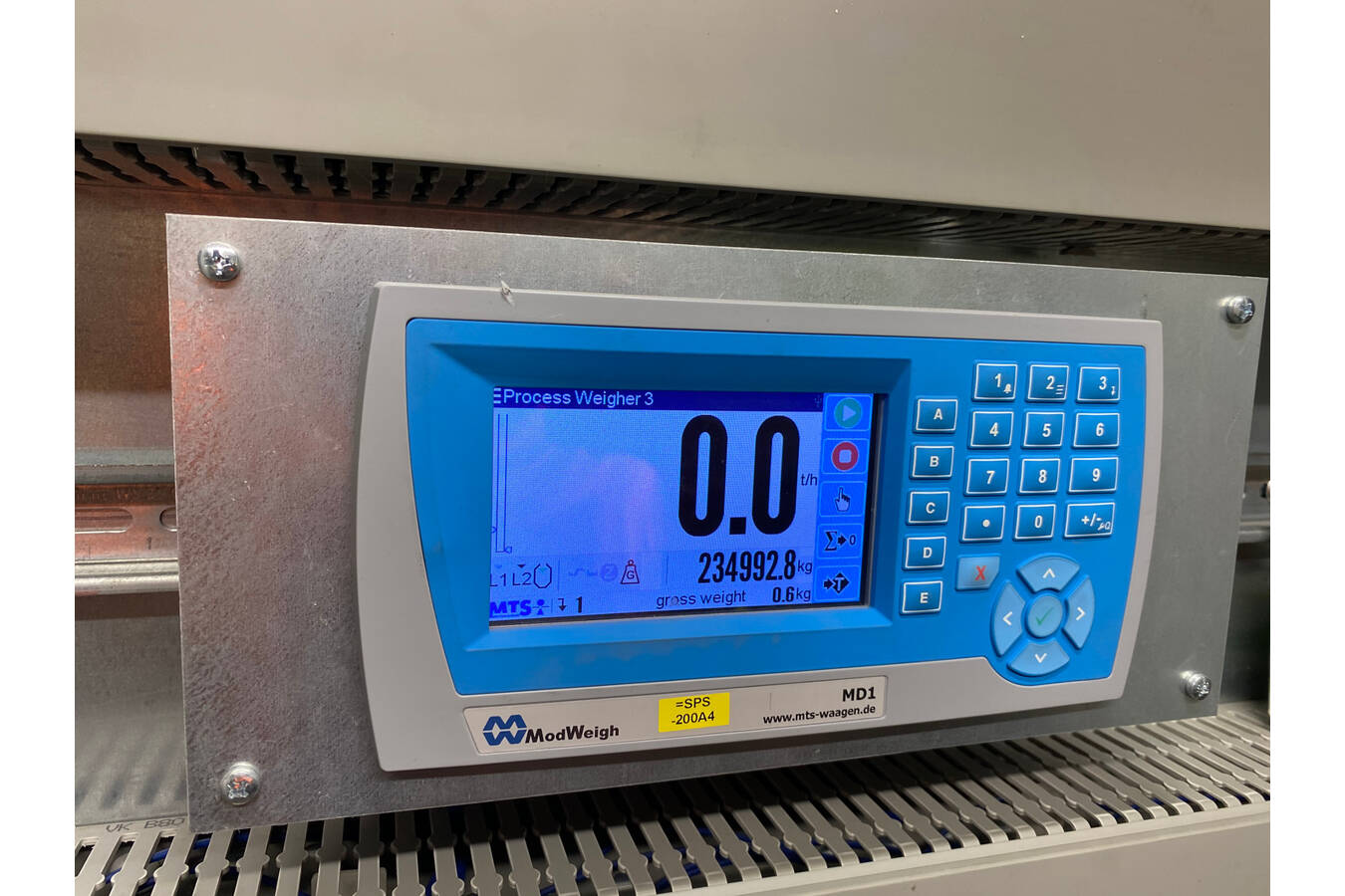 Die Steuerung der Befüllung und Entleerung sowie die Auswertung der Wägezellensignale übernimmt die leistungsfähige Auswerteelektronik ModWeigh Batch. Die Wägeelektronik erfasst zum einen den Gewichtswert des Wägebehälters und akkumuliert die einzelnen Batchwerte als Summenwert im Summenzähler. Gleichzeitig generiert die Elektronik aus den Gewichtswerten der einzelnen Batches und der für eine Verwiegung ermittelten Zeiteinheit auch die Durchsatzmenge in kg/h bzw. t/h. Die Klappe wird autark über das ModWeigh angesteuert. Über Profibus DP oder Profinet lassen sich die Messdaten zusätzlich an das Prozessleitsystem des Kunden übermitteln.