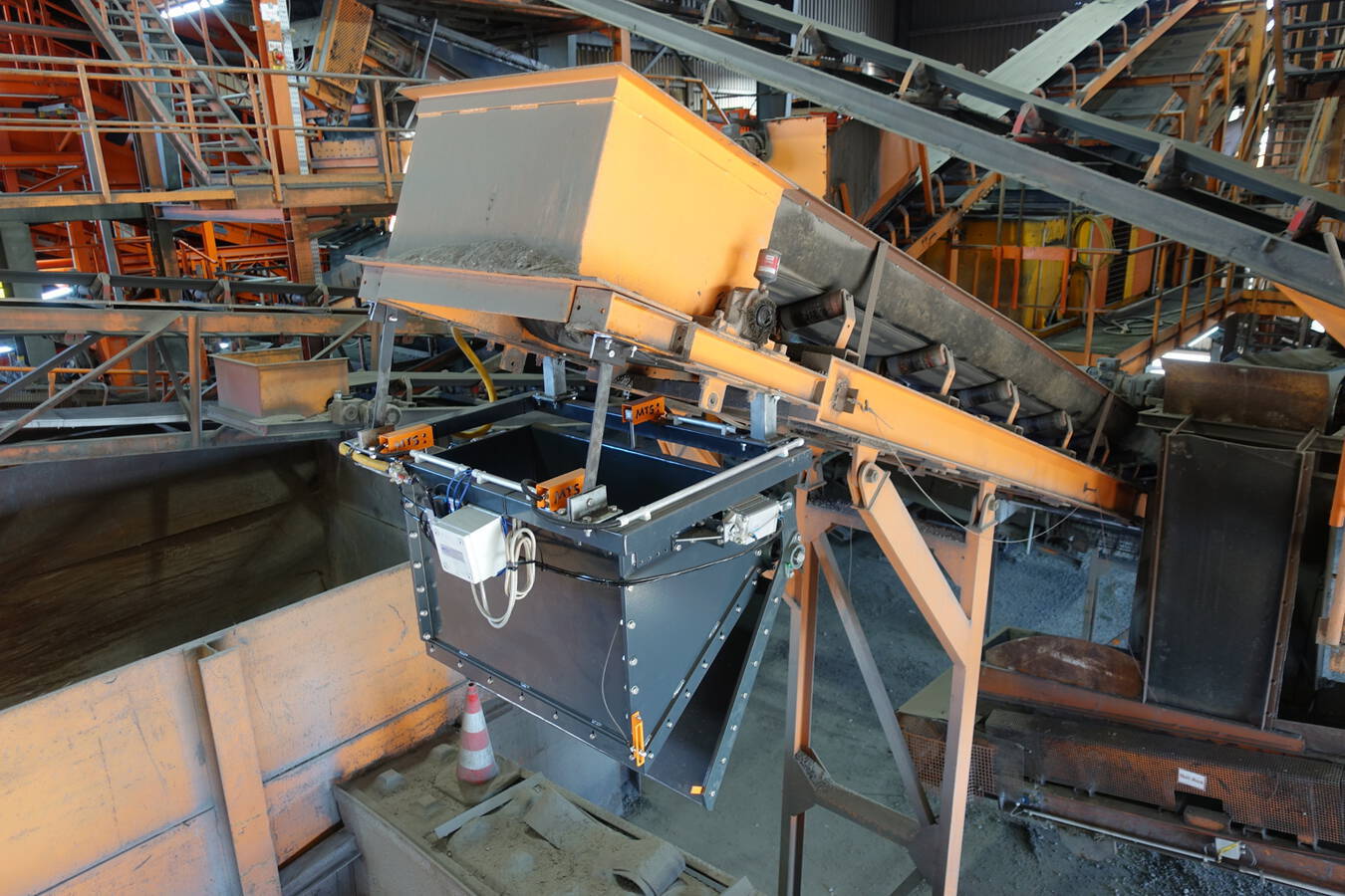 Bei der Besichtigung der Anlage wurde schnell klar, dass aufgrund der geringen Fördermengen und der Anlagensituation bei dieser geplanten Anwendung keine klassische Einbau-Bandwaage zum Einsatz kommen kann. Trotzdem sollte die Mengenerfassung der Wertstoffe exakt bei laufendem Produktionsprozess erfolgen. MTS entwickelte hierfür eine Behälter-Klappenwaage zur Installation direkt am Abwurfpunkt des gewählten Gurtförderers.