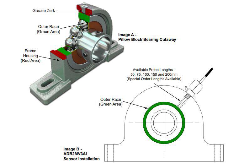 Der Sensor wird durch den vorhandenen Schmiernippel direkt in ein Lagergehäuse geschraubt. Jeder Sensor ist mit einem Schmiernippel versehen, über den das Lager ohne Ausbau des Sensors geschmiert wird.