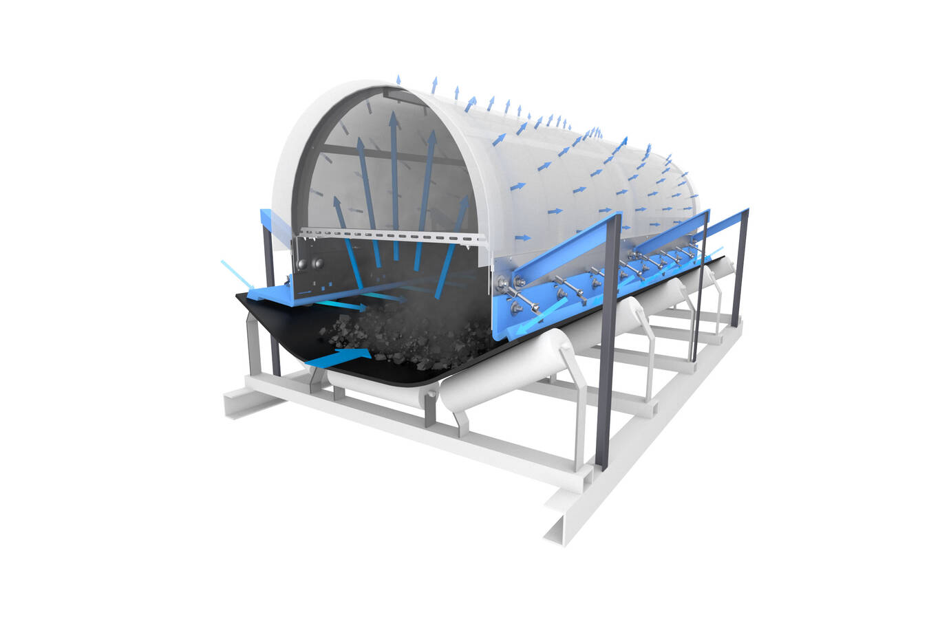 DustScrape kontrolliert den Staub an den Übergaben An den Förderbandübergaben kontrolliert der DustScrape mit einem Filtertuch den Staub. Einfach, aber sehr effektive.