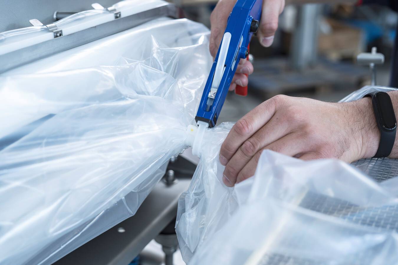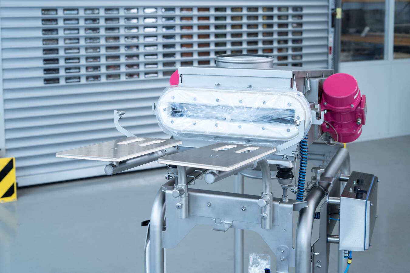 Das neue Containment-Sieb basiert auf einem Single-Use-Konzept, das mit Spezialfolie arbeitet: der Bediener dockt einfach einen vorbereiteten Foliensack an die Maschine an, mit dessen Hilfe kontaminierte Siebeinleger sicher aus-, und neue Siebeinleger eingeschleust werden können.