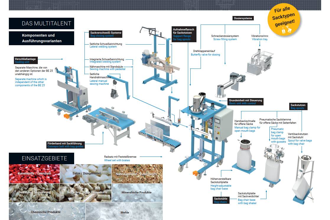 Es können alle Arten von Offen-/Ventilsäcken, sowie Eimer und Kartons mit der Multifill BE25 befüllt werden. Verschiedene Produkte mit unterschiedlichen Fließeigenschaften können durch verschiedene Dosiersysteme, wie Dosierklappe, Dosierschnecke oder Vibrationsrinne zugeführt werden.