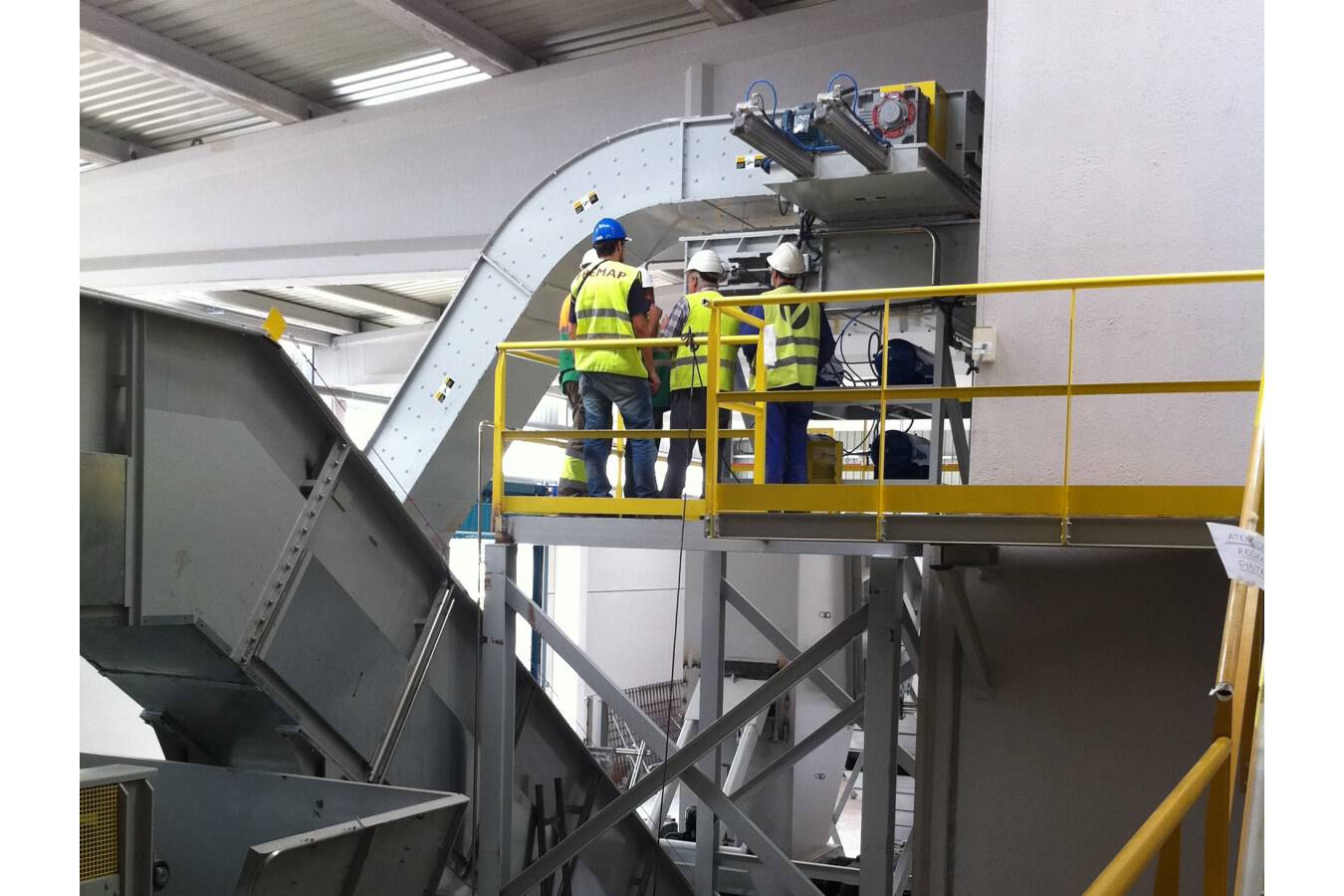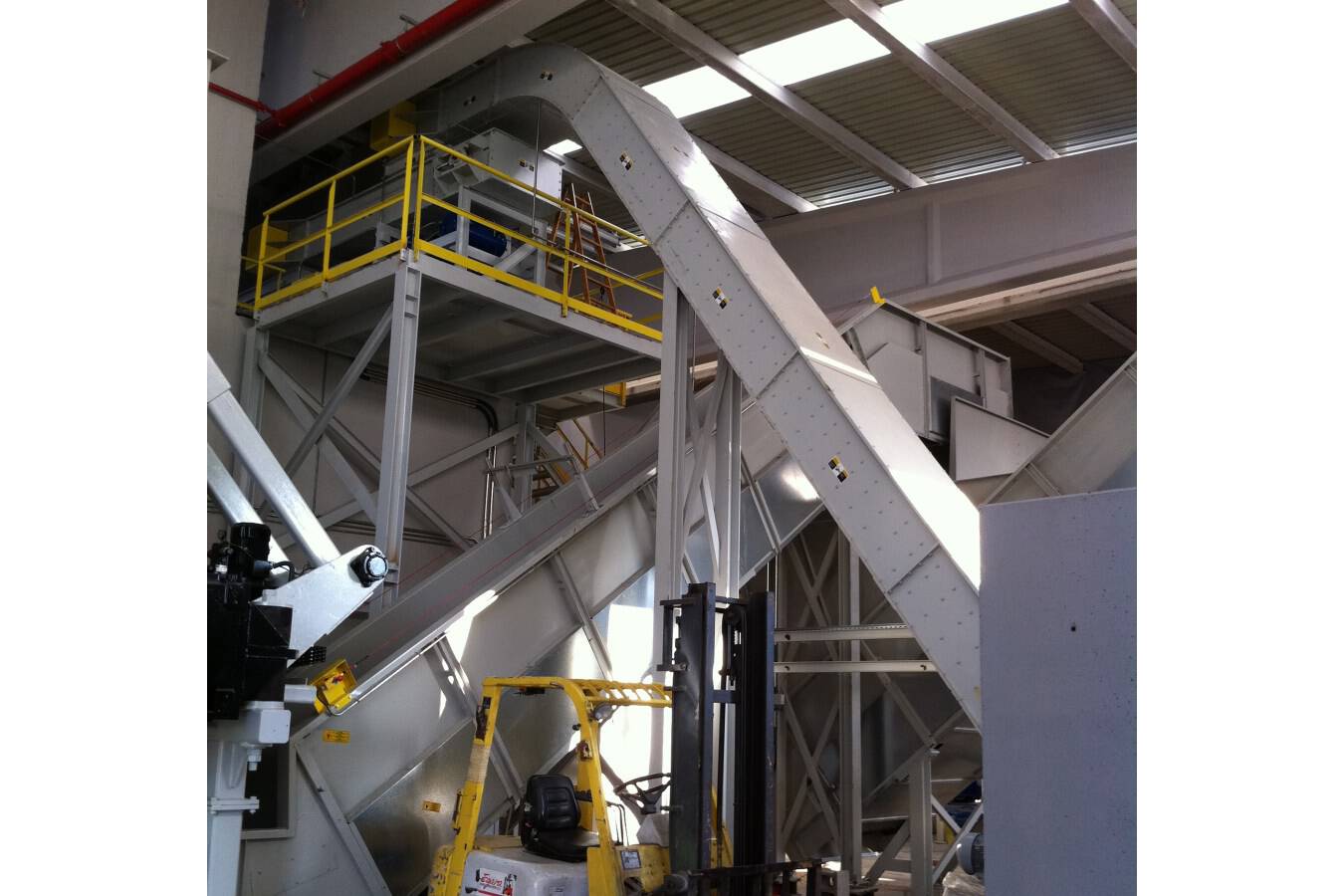 Um diesen Bedarf zu decken, entwarf Sinfimasa drei Kettenförderer; der erste transportiert die KUPs in einer horizontalen Entfernung von etwa 10 m und hebt sie auf eine Höhe von 8 m. Der zweite Förderer ist horizontal über eine Strecke von 4,7 m positioniert. Eine wichtige Funktion dieses Förderers ist es, die Sektorisierung zweier Brandabschnitte zu gewährleisten, weshalb er mit Brandwandschiebern ausgestattet wurde.
