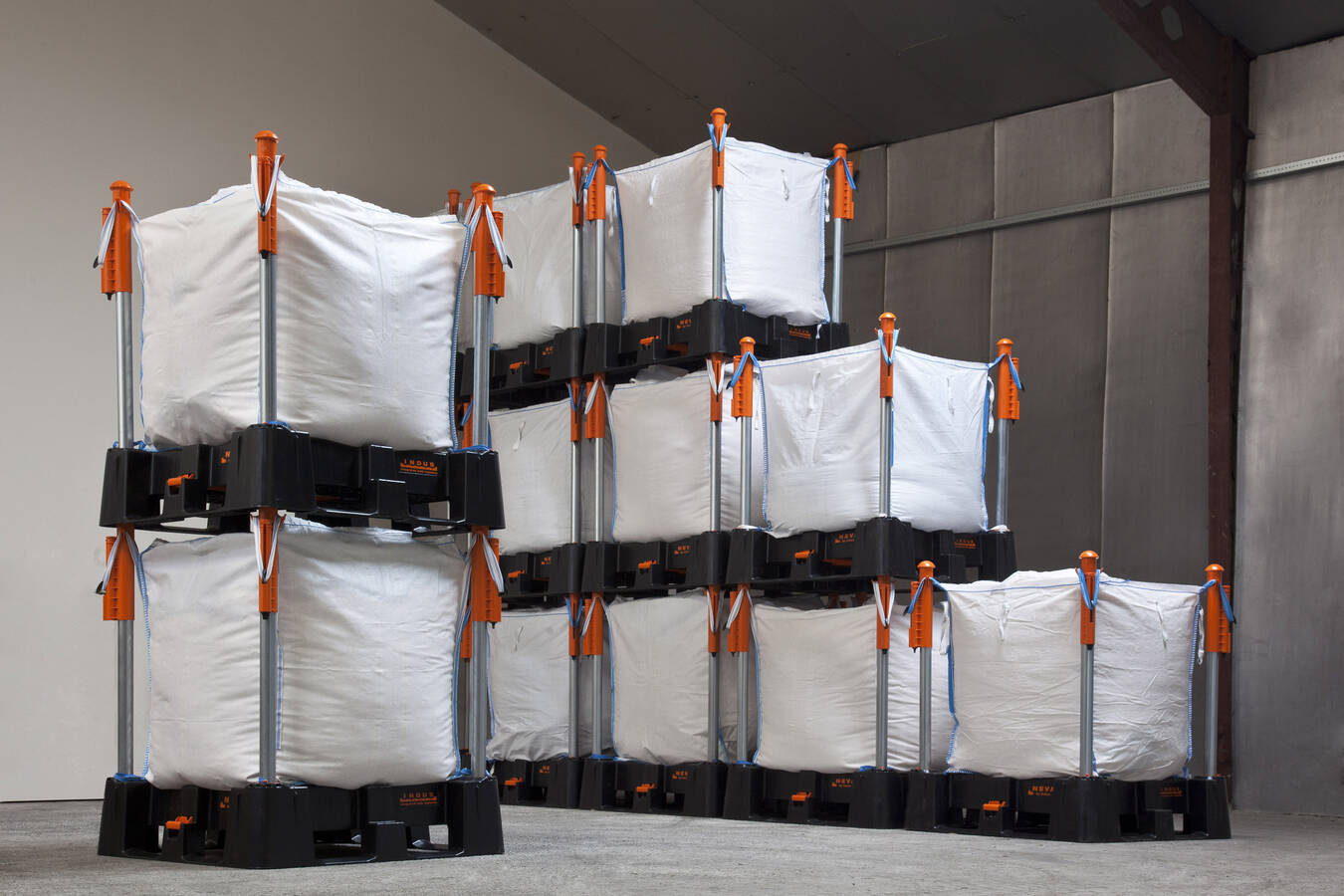 Das System eignet sich zur Entleerung von Big Bags bei knapper Raumhöhe, Big Bags ohne Kran sicher auf der Austragsstation zu positionieren und wenn mehrere Big Bags sicher gestapelt werden sollen, ohne Gestelle verwenden zu müssen.