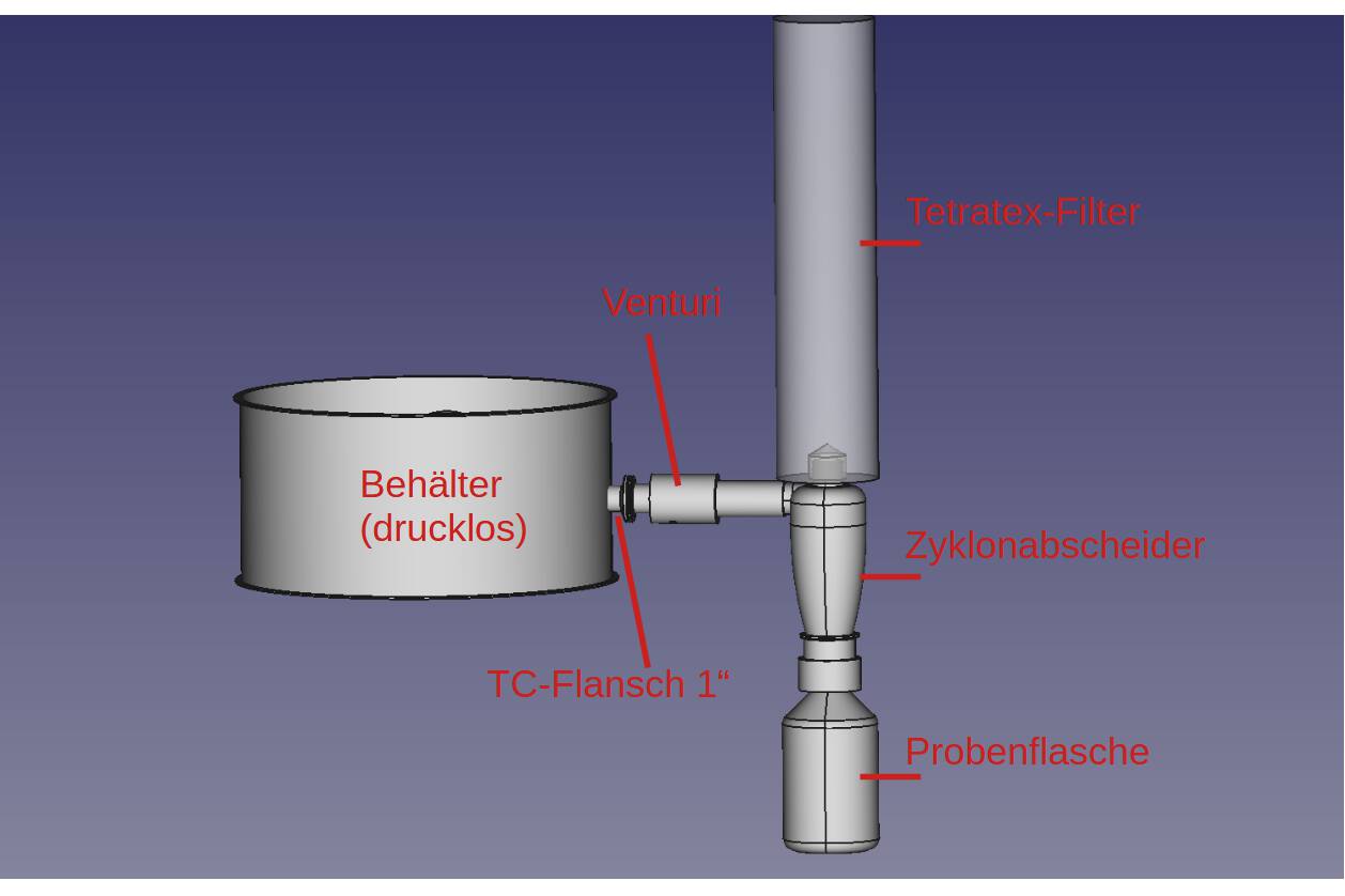 Das stehende Produkt wird kurzzeitig angesaugt und durch einen Luftstoß über einen Zyklon in eine Probenflasche abgeschieden.
