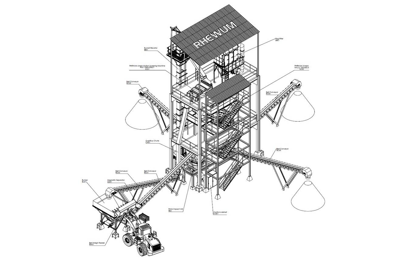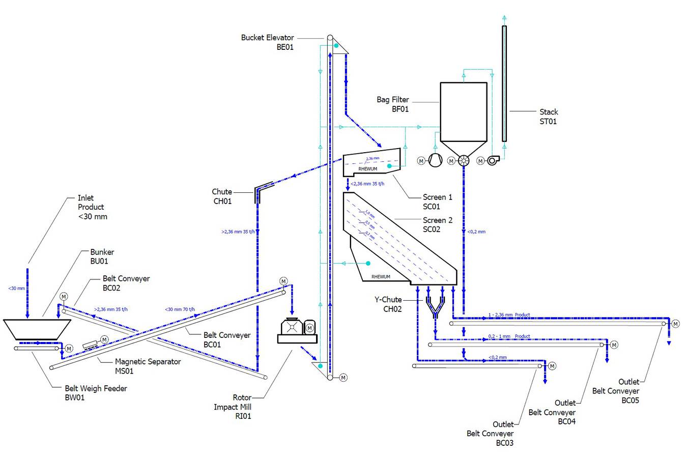 Das Flowsheet (siehe Skizze 2) zur Sandaufbereitungsanlage aus Skizze 1 beinhaltet nur das Nötigste zur Erzeugung von Sand aus Kies. Nach der Aufgabe wird der Materialstrom mittels Dosierbandwaage aus einem kleinen Vorlagebehälter abgezogen und zur Anlage befördert. Zum Schutz der Mühle werden auf dem Weg größere Metallteilchen abgeschieden. Eine energetisch effiziente Rotorprallmühle erzeugt in dieser Konfiguration die benötigten Fraktionen, die über ein Becherwerk auf ein Grobsieb transportiert werden. Während das Überkorn wieder zurück zur Aufgabe geführt wird, verlässt die nutzbare Fraktion das Grobsieb und wird anschließend auf einer direkt erregten Magnetsiebmaschine in verkaufsfertige Fraktionen gesiebt. Diese werden für den Abtransport mittels Bänder auf kleine Halden zum Verkauf abtransportiert. Sowohl die Beschickung als auch der Abtransport erfolgen flexibel mithilfe von Radladern.