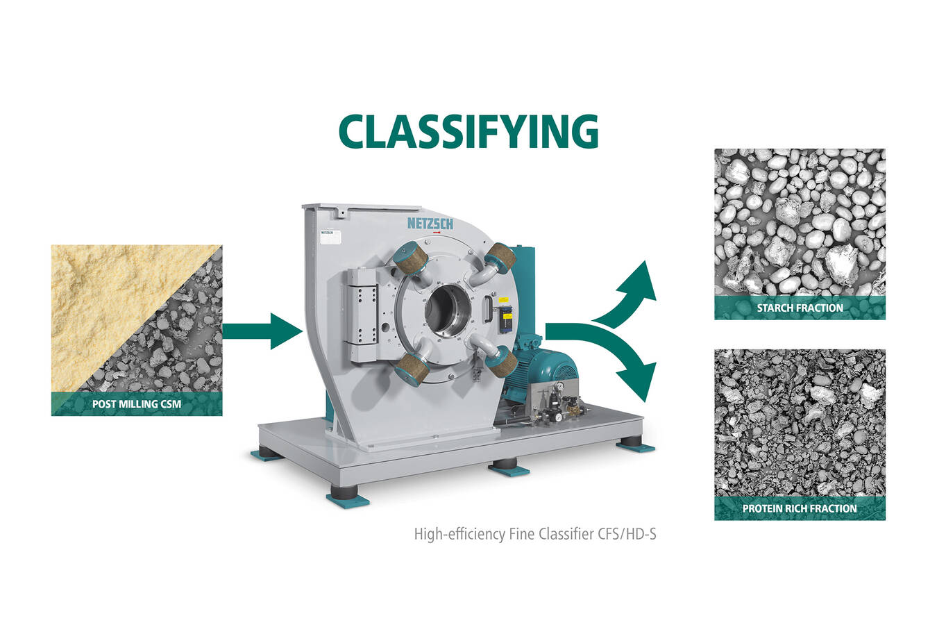 Mit Hilfe eines Hochleistungssichters wird das Mehl anschließend in eine eiweißreiche und eine eiweißarme Fraktion („Stärkefraktion“) getrennt. Da in diesem Feinheitsbereich herkömmliche Sichter an ihre Grenzen stoßen, wird die Trennung mit dynamischen Windsichtern durchgeführt. Um höchste Ausbeuten bei minimalem Proteinverlust in der Stärkefraktion zu erreichen, wird der NETZSCH-Hochleistungs-Feinsichter CFS/HD-S, eingesetzt. Dazu wird das gemahlene Produkt in einen Ringspalt geleitet, der zur optimalen Dispersion mit Luft beaufschlagt wird. Durch den Ringspalt werden die Partikel in eine Kreislaufbewegung versetzt und durch die zusätzlichen Zentrifugalkräfte voneinander getrennt. Die Trennung ist im Vergleich zu herkömmlichen Sichtertypen wesentlich effektiver.