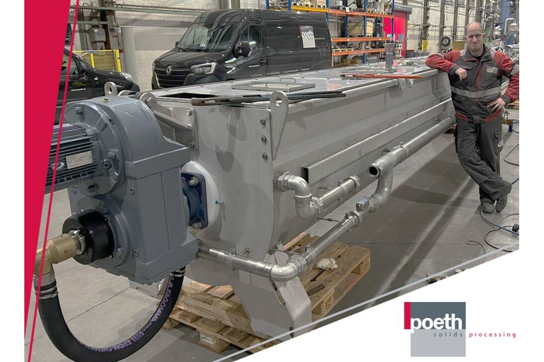 Poeth hat in Nazareth Belgien, eine hochmoderne Mischanlage in Betrieb genommen, die sich durch außergewöhnliche Effizienz auszeichnet und den höchsten Qualitätsstandards entspricht. Nachdem Escaut Valley kürzlich ein erfolgreiches Projekt für Backzutaten abgeschlossen hatte, entschied man sich schnell für das Know-how von Poeth. Das Projekt erforderte eine Lösung, die eine begrenzte Höhe zulässt und die Anzahl der Komponenten und Maschinen minimiert. Poeth begegnete diesen Herausforderungen mit einem gut durchdachten Design, das sich auf die Reinigungsfähigkeit und Zugänglichkeit konzentrierte. Die Zutaten werden pneumatisch von einem Sackentleerungsschrank zum Mischer befördert, während eine Kontrollwaage den genauen Inhalt der Charge sicherstellt. Ein Rüttelsieb und ein Metalldetektor garantieren, dass die Mischung frei von Fremdkörpern ist. Prüfungen und Inbetriebnahme Die Versuchsanlage in Pöth verfügt über einen Zweiwellen-Paddelmischer mit Flüssigkeitszugabe. Zerstäubungsdüsen verteilen die Flüssigkeit fein über das fluidisierte Pulverbett, so dass innerhalb von 50 Sekunden eine Trockenmischung mit einer Homogenität