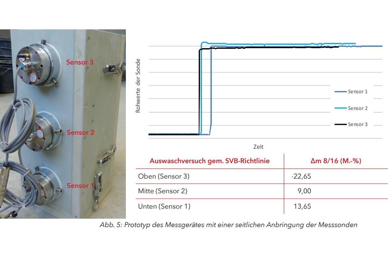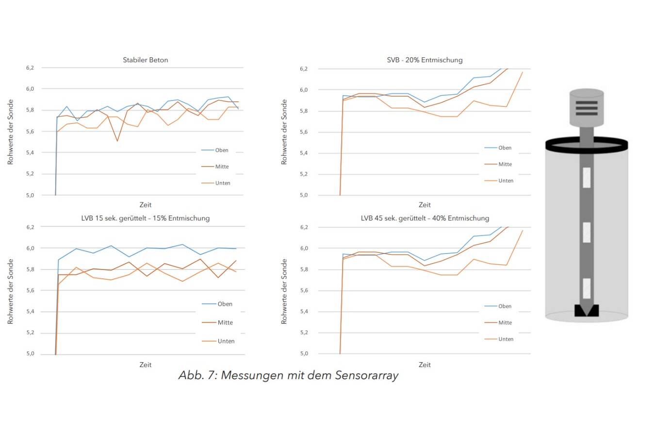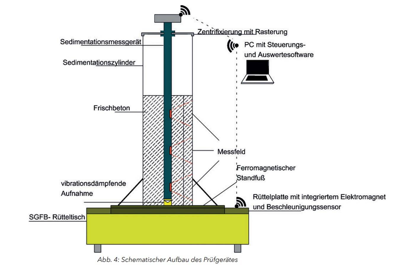 Am Institut für Werkstoffe im Bauwesen (IWB) der Universität Stuttgart wird eine sensorbasierte Prüfmethode entwickelt, um insbesondere weiche Betone auf Sedimentationsstabilität zu untersuchen. Erste Vorversuche bestätigten das Grundprinzip. Das Prüfgerät, als „Drei-Zylinder-Test“ bezeichnet, füllt eine zylindrische Form mit Frischbeton. Ein Sensorarray im Zylinderzentrum erfasst elektronisch das Sedimentationsverhalten und ersetzt das aufwendige Auswaschen der drei Segmente. Die Kommunikation zwischen Sonde und Software erfolgt kabellos.