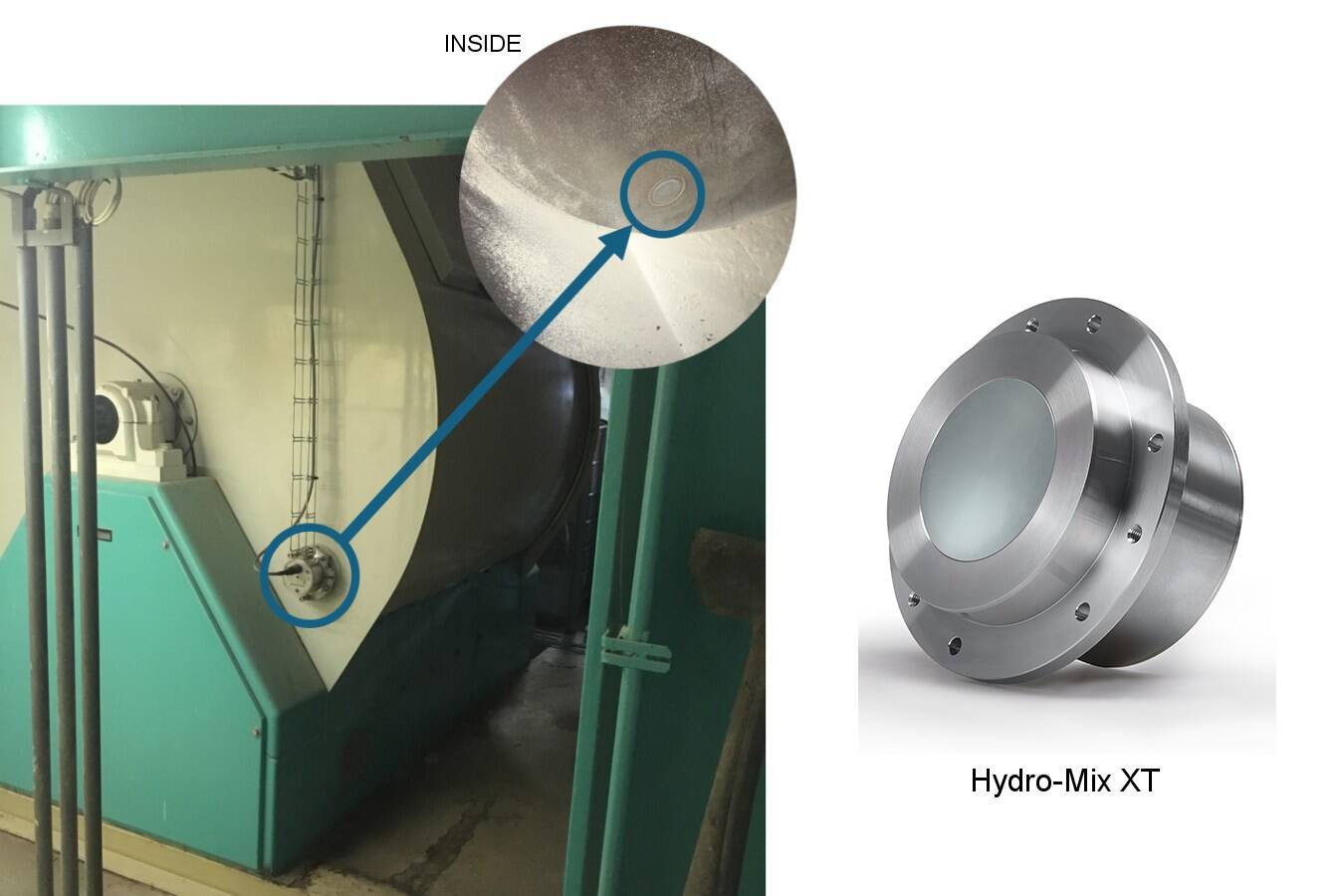 Auf dem Foto sehen Sie ein Beispiel für einen Feuchtesensor, der in einem Bandmischer installiert ist. Der Hydro-Mix XT-Sensor wird in der Stirnwand des Mischers installiert, um sicherzustellen, dass die Mischung die richtige Feuchtigkeit hat, homogen gemischt wird und für den nächsten Prozessschritt bereit ist.