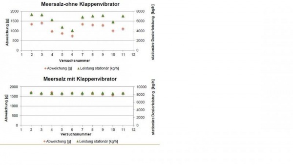 Vidos-Armaturen entziehen der Brückenbildung gezielt einer ihrer Voraussetzungen. Die Klappenscheibe vibriert horizontal mit ein-der gleichen Achse wie der Siloauslauf erfolgt, können beispielsweise Silos oder Vorlagebehälter unmittelbar über der Wägeeinrichtung oder dem Mischer angeordnet werden, eine Querförderung entfällt. Zudem beeinflussen die geringe Einbauhöhe und die deutlich reduzierten Investitionskosten sowohl die Gestellungskosten der Anlage als auch die Folgekosten für Instandhaltung und Betrieb (Total Cost of Ownership, TCO). Wie sich der Einsatz der Klappen mit Vibrator auf die Wiederholgenauigkeit auswirkt, zeigt