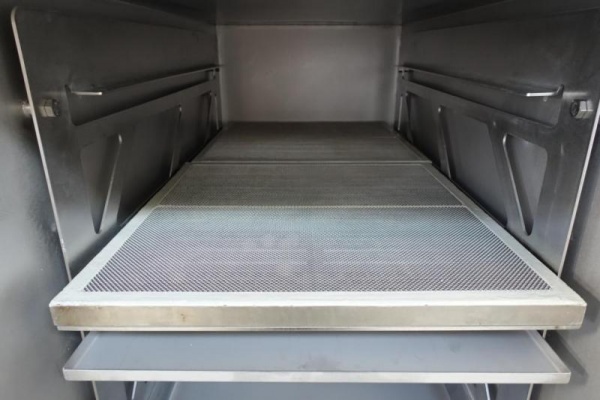 Die Ingenieure der Engelsmann AG konstruierten daraufhin einen speziellen Lagerschrank, in den die Siebeinleger komplett mit dem jeweils integrierten Ultraschallabreinigungssystem sicher eingeschoben werden können. Der Schrank kann mit Hilfe einer robusten Tür, Spannvorrichtungen und einer durchgängigen Dichtung staubdicht verschlossen werden. Da der Betreiber auch wärmere Produkte siebt, wurde die Tür mit Entlüftungsschlitzen ausgeführt, so dass aufgeheizte Siebeinleger ungehindert abdampfen können, ohne dass sich im Lagerschrank selbst zu viel Feuchtigkeit bildet. Neben diesen produktionstechnischen Aspekten liegt ein weiterer Vorteil dieses Einlegerschrankes darin, dass man damit auch einen optimalen Transportbehälter gewonnen hat, falls die Siebeinleger intern zur Siebmaschine transportiert oder zur Neubespannung extern verschickt werden müssen. Der Schrank kann im Bedarfsfall bequem mit einem Stapler aufgenommen oder bei der mobilen Variante auf Rollen bewegt werden.