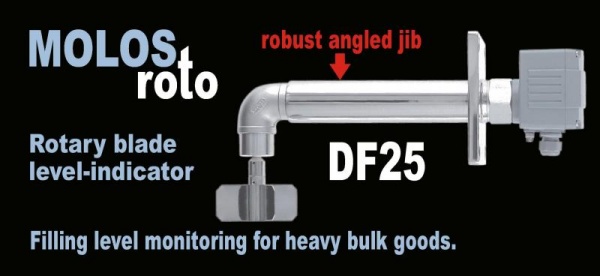 MOLOSroto Drehflügelmelder sind die richtige Wahl für die Füllstandüberwachung in allen Schüttgütern. Egal ob es sich um staub- oder pulverförmige, granulierte, körnige oder grobkörnige Materialien handelt, diese Füllstand-Grenzschalter gewährleisten auch unter schwierigsten und extremsten Bedingungen absolute Funktionssicherheit und Zuverlässigkeit. Auch die Füllstandmessung in Schlämmen und Pasten sind kein Problem. Der MOLOSroto DF25 ist wie alle Füllstandanzeiger dieser Baureihe mit Staub- und Gasexplosionszulassungen erhältlich und kann sogar in hochexplosiven hybriden Gemischen eingesetzt werden. Auch Schüttguttemperaturen bis 350 oC stellen für dieses Messgerät kein Problem dar. Mit dem Zubehör „Bereichs-Trennelement“ kann der MOLOSroto DF25 auch bei Prozessdrücken bis 25 bar verwendet werden. Derartige Einsatzmöglichkeiten machen den MOLOSroto DF25 Füllstandschalter einzigartig auf dem Weltmarkt.