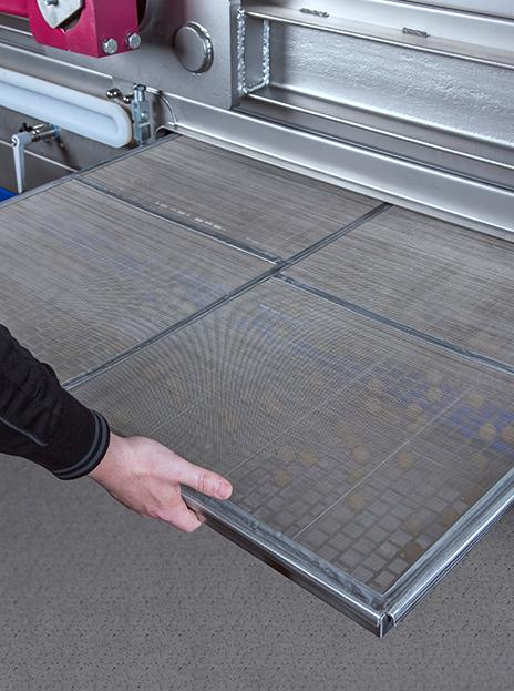 Die Siebeinleger werden seitlich in die Kassetten eingeschoben, so dass der Siebwechsel in kürzester Zeit durchgeführt werden kann. Ein Anheben der einzelnen Kassetten ist dabei nicht notwendig.