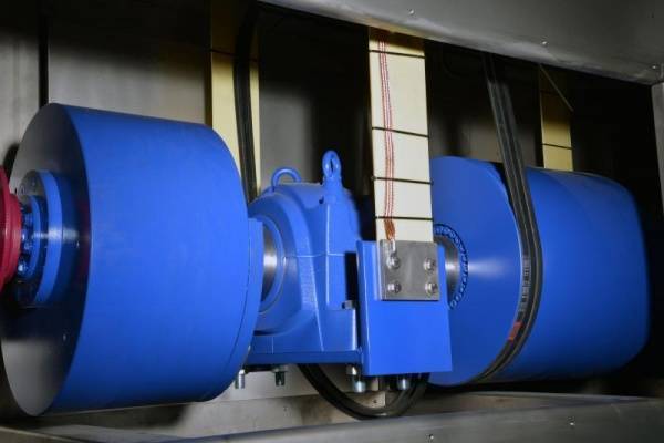 Ein weiterer Vorteil des Langhubprinzips ist der energiesparende Schwungantrieb. Ein Elektromotor überträgt die Kraft mittels eines Keilriemens auf Schwungscheiben. Die an den Schwungscheiben angebrachten Schubstangen bringen den Siebtrog in seine horizontale Schwingbewegung, wobei der Trog bereits nach 15 Sekunden mit nur noch 10-20 Prozent des Nennstroms in Bewegung gehalten wird–eine echte Kostenersparnis, gerade bei großen Siebmaschinen. Zu den großen Exemplaren zählt auch das Langhubsieb für den Teehersteller: um eine Durchsatzleistung von 2.000 kg/h zu erreichen, verfügt das 7 Meter lange Sieb über eine Siebfläche von 16 m², aufgeteilt auf ein Ober- und Unterdeck.